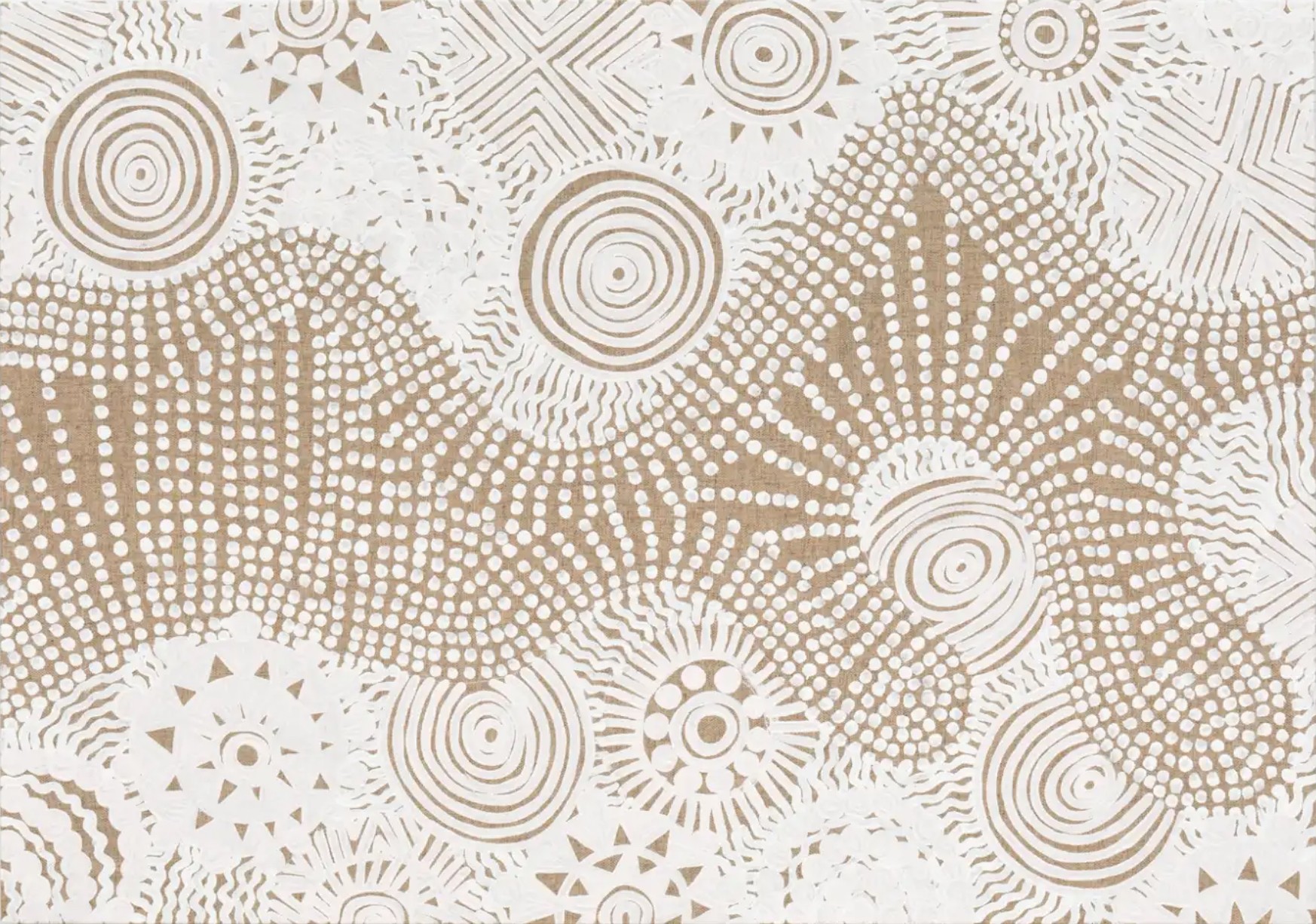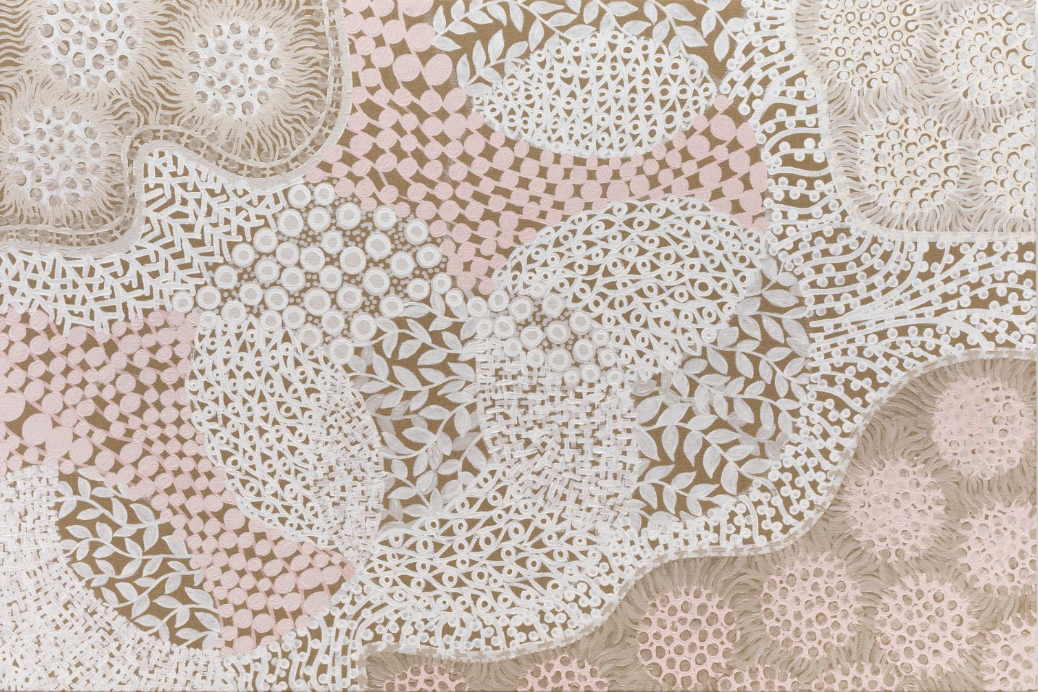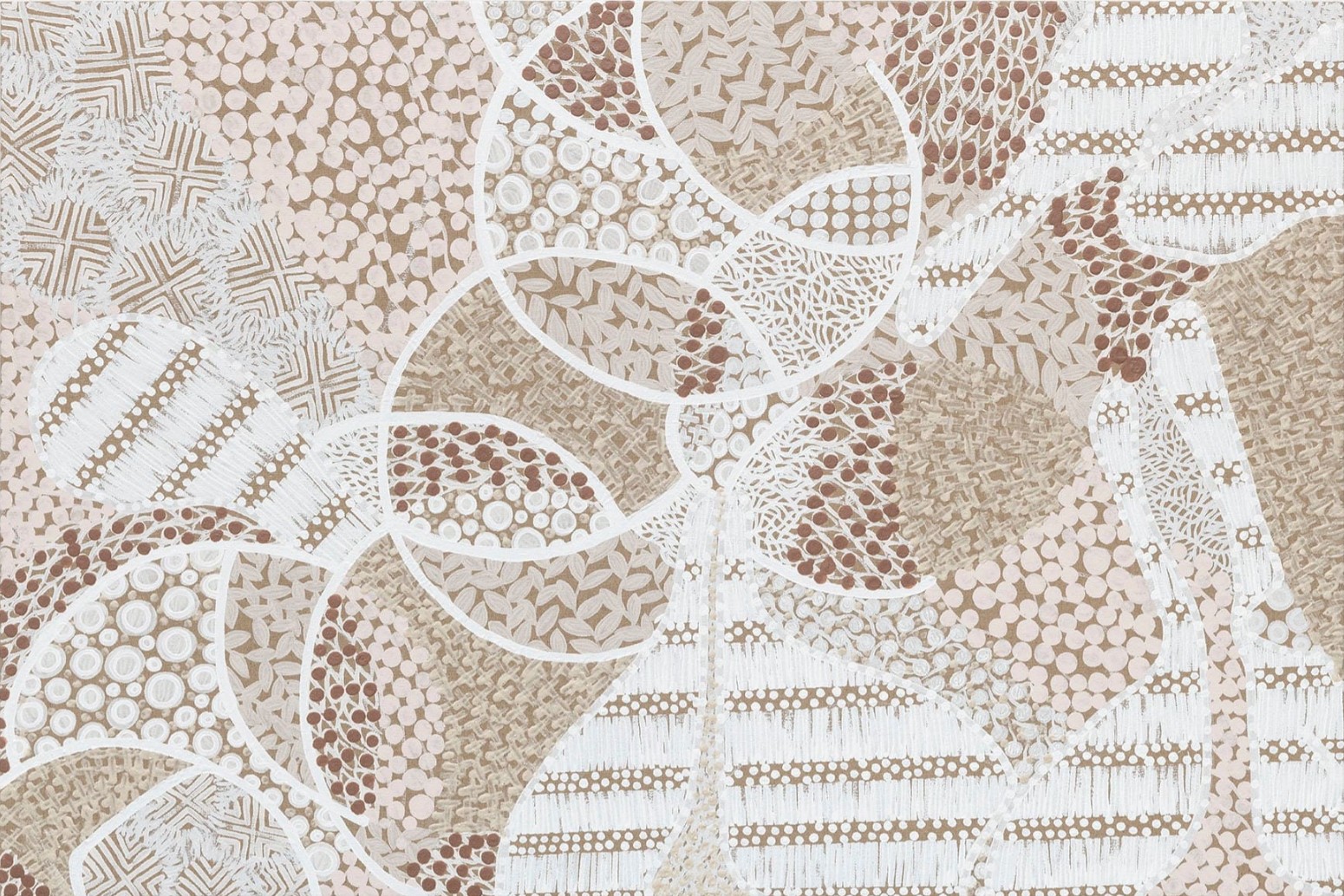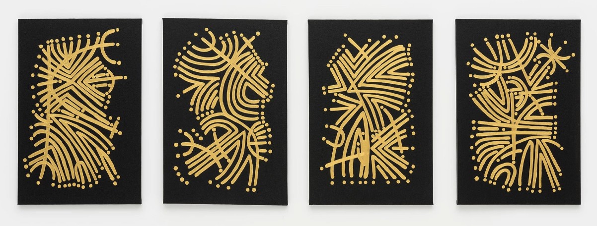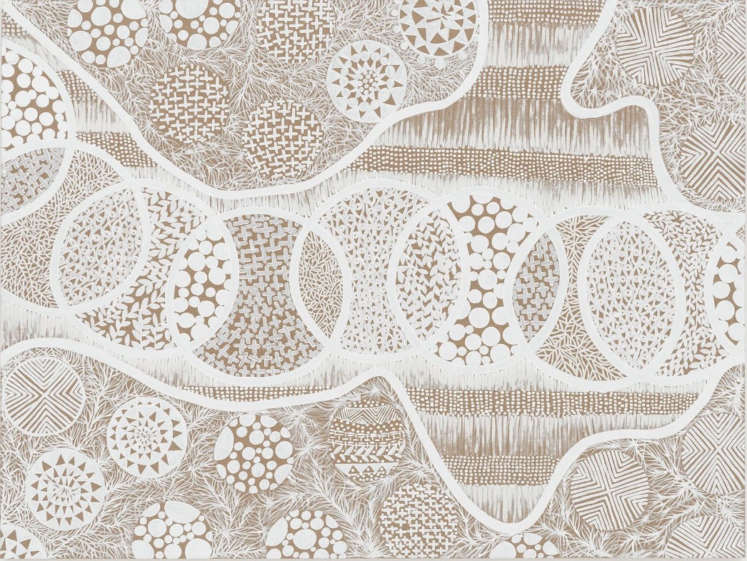 Pankararu graduated from medical school but chose, in 2019, to return to his love for making art. Self-taught, the artist combines his knowledge of molecular and other microscopic structures with his cultural traditions in his work. He creates abstractions filled with complex geometries and ornate patterns. Among the important cultural traditions influencing Pankararu is a ritual dance called the Toré which connects the physical and supernatural realms by blending music, movement, and body painting. The white paints that the artist uses are inspired by his culture's body painting. Eventually he found a way of making paint from the actual white clay used for body painting, which allowed him to integrate this important aspect of his identity into his works. The artist is thoughtful about being respectful and ethical in his use of his people’s traditions in his desire for the Pankararu culture to become more known and understood. At the same time, the artist wants to incorporate what he calls “novelty” into his work. At times, it is surprising how much variety Pankararu produces with relatively simple means.