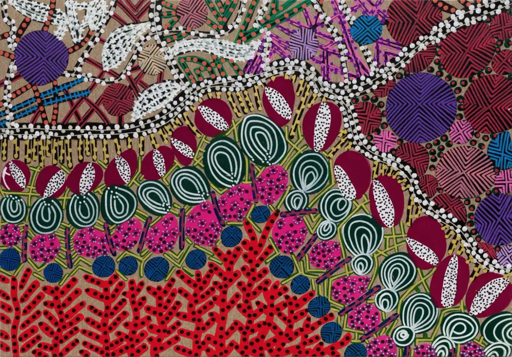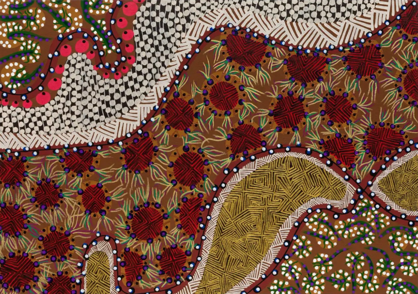 Born in Petrolândia in the state of Pernambuco in northeastern Brazil, Pankararu now lives and works in São Paolo. His surname indicates his affiliation with the Pankararu, an indigenous people of that region of Brazil. The artist learned his cultural traditions from his grandmother during childhood in Brejo dos Padres, a significant location within the Pankararu Indigenous Land. Established just 3 years before the artist’s birth, the region is protected land but, as is too often the case, these indigenous people must continue to fight to maintain possession of and control over their territory in the face of settlers seeking farmland. One of the artist’s purposes is to express his people’s beliefs and traditions and to support their resistance and struggle against cultural and territorial loss through images that heal and soothe.