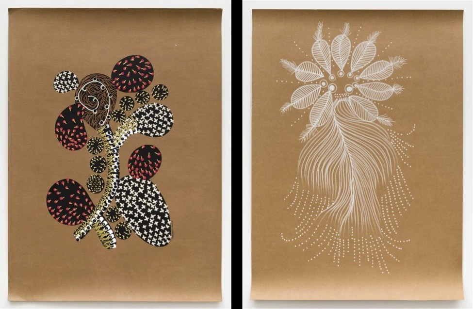 Another important Pankararu belief that influences the artist’s work is the spiritual beings called the Encantados (The Charmed or Enchanted Ones) who live in the mountains and hills around Brejo dos Padres. The Pankararu people believe that the Encantados manifest themselves as seeds in the human world. Many of Pankararu’s works have patterns and shapes reminiscent of seeds, as well as leaves, cacti, roots, and grasses. These forms are especially recognizable in the artist’s works in color, but also inspire patterns in the white works. To the artist, color is vibrant and magical. This brings us to the third of Pankararu’s sources of inspiration, the caatinga biome of northeastern Brazil. A semi-arid region characterized by shrublands, thorny forests, cacti, and dry grasses, the caatinga is unique to Brazil and has been devastated by past land-use practices such as overgrazing and timber-cutting. The artist’s celebration of the plant and land forms of his native region is a form of indigenous activism and related to his support for protecting the Pankararu Indigenous Land. (Research has shown that protecting indigenous lands results in environmental preservation.) Pankararu was drawn to brown craft paper as a drawing support because it reminded him of the brown earth of his semi-arid homeland. As seen in the paired drawings in the slide show (Força and Untitled, 2023), both color and white stand out from the brown of the paper. The artist has also observed that the color of the paper is very similar to his own skin tone, so the works in white on craft paper refer back to the practice of body painting.