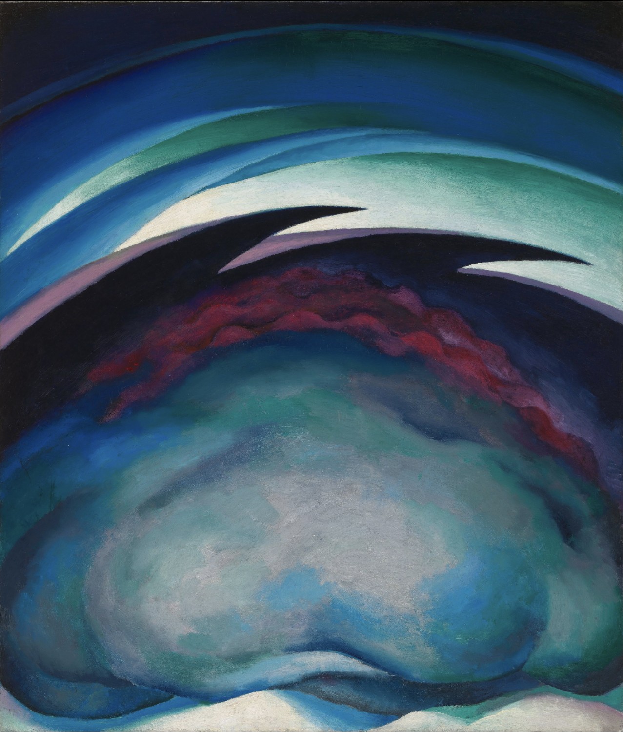 These same characteristics can be identified in the United States, although they don’t appear until the first decade of the 20th century. The rise of American Modernism is associated with artists who had some contact, either direct or secondhand, with developments in Europe. One of the key figures was the photographer and gallerist Alfred Stieglitz (American, 1864-1946) who promoted Modernist art by Europeans and Americans at his galleries 291, The Intimate Gallery, and An American Place from 1905 to 1937. Nearly all of the artists in this slide show exhibited with Stieglitz and many were close friends and associates. In addition to Georgia O’Keeffe (American, 1887-1986) to whom Stieglitz was married and whose works he frequently exhibited, Oscar Bluemner (Prussian-American, 1867-1938), Charles Demuth (American, 1883-1935), Arthur Dove, and Marsden Hartley (1877-1933) were all promoted by Stieglitz.