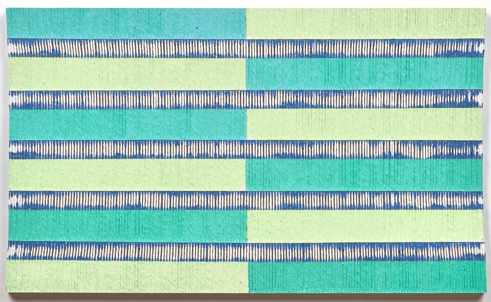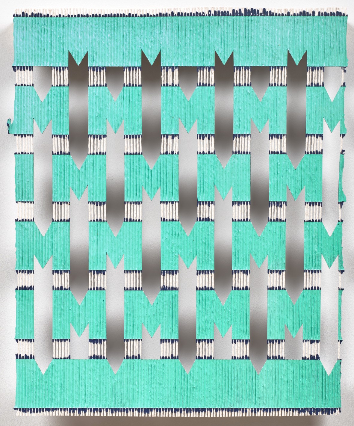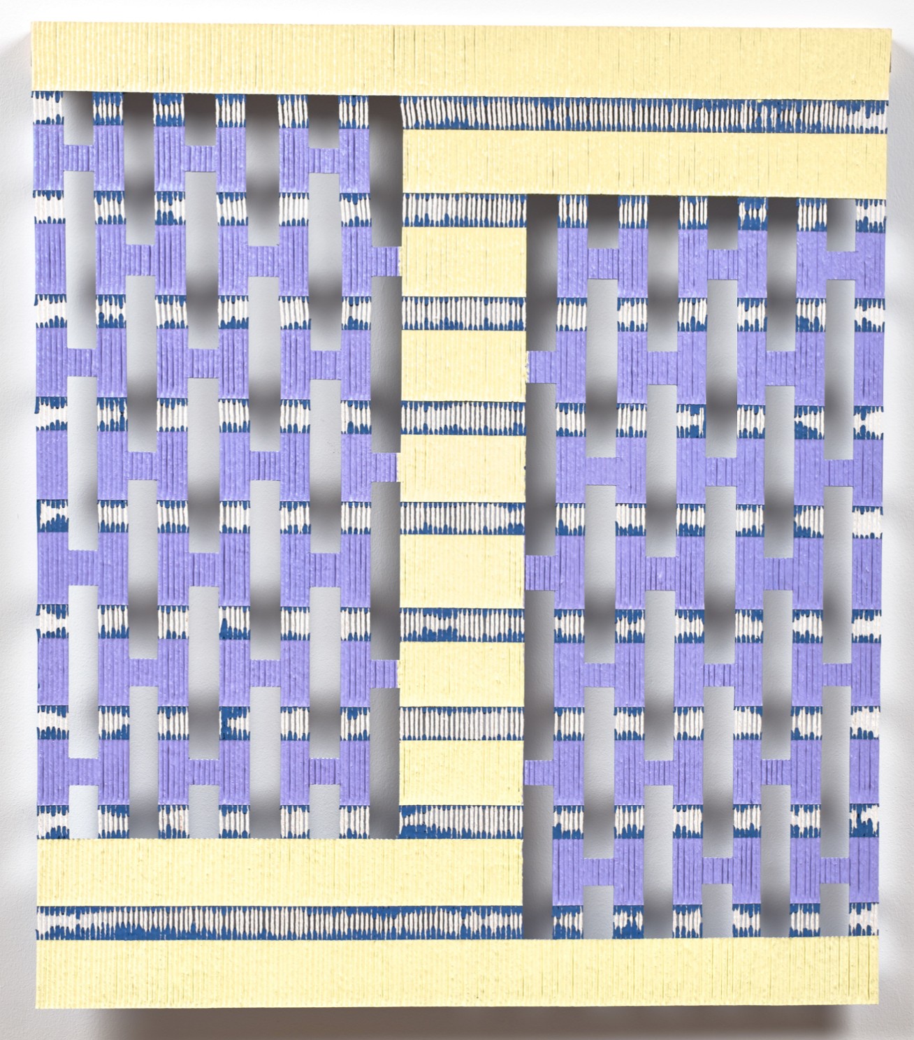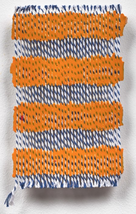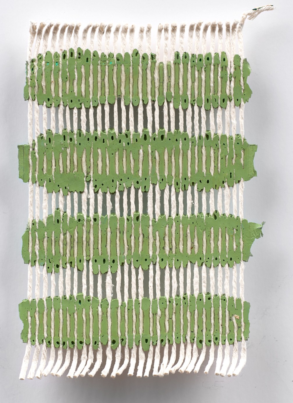 Just five years removed from his university studies, Brandon Logan (Scottish, b. 1996) has drawn considerable attention for his unique approach to painting. After laying out a series of parallel strings, akin to the warp threads laid down when weaving, Logan applies acrylic paint in stripes, patches, or blots across the strings. When dry, the paint and strings provide mutual support in the finished work. In some cases, the artist then cuts away areas of string and paint to create repetitive patterns. Within this basic technique, Logan can achieve great variety by varying the scale of the works, the kind of string, the spaces between threads, the amount, color, and layering of paint, and the cutting patterns. Though the unframed objects have a sculptural quality and an affinity to weaving, the artist says