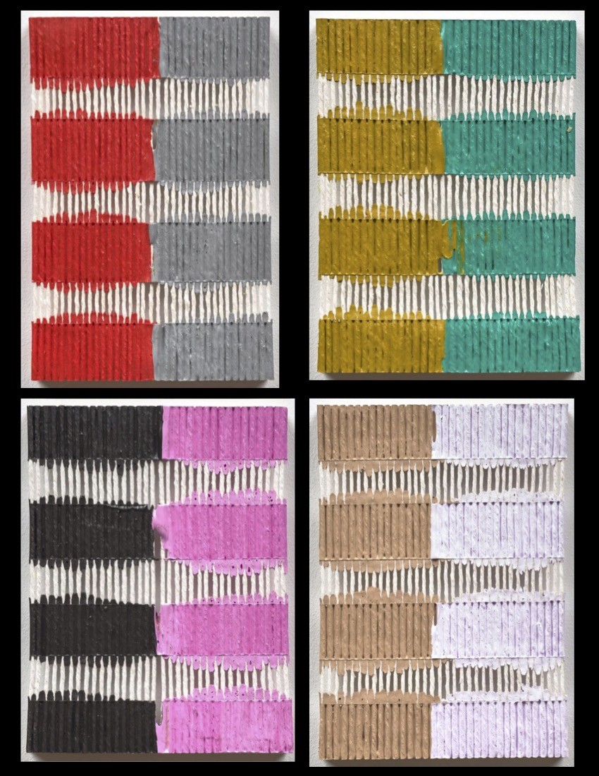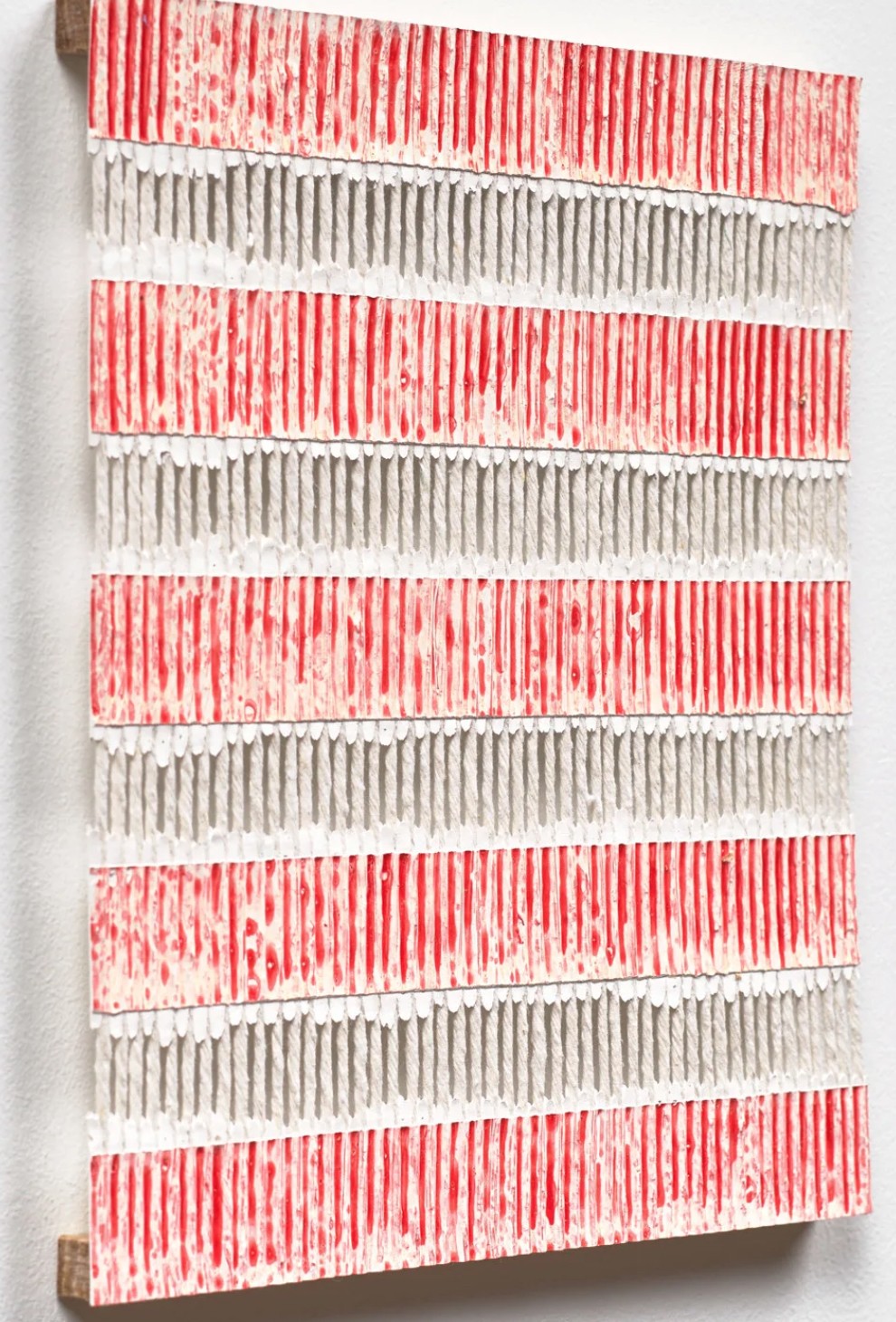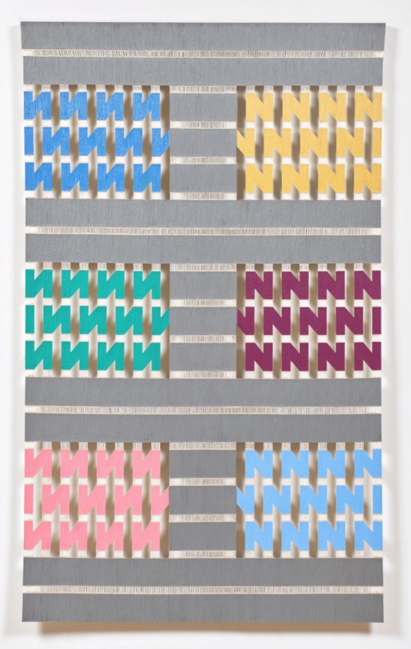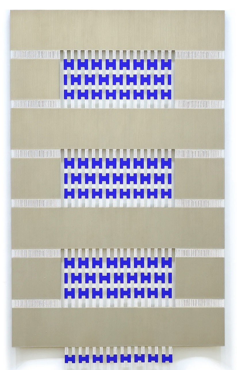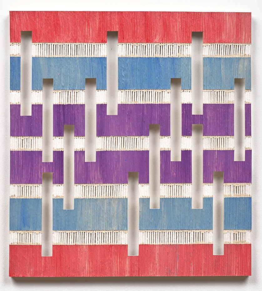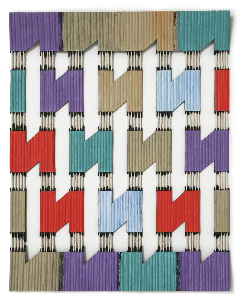 Just five years removed from his university studies, Brandon Logan (Scottish, b. 1996) has drawn considerable attention for his unique approach to painting. After laying out a series of parallel strings, akin to the warp threads laid down when weaving, Logan applies acrylic paint in stripes, patches, or blots across the strings. When dry, the paint and strings provide mutual support in the finished work. In some cases, the artist then cuts away areas of string and paint to create repetitive patterns. Within this basic technique, Logan can achieve great variety by varying the scale of the works, the kind of string, the spaces between threads, the amount, color, and layering of paint, and the cutting patterns. Though the unframed objects have a sculptural quality and an affinity to weaving, the artist says