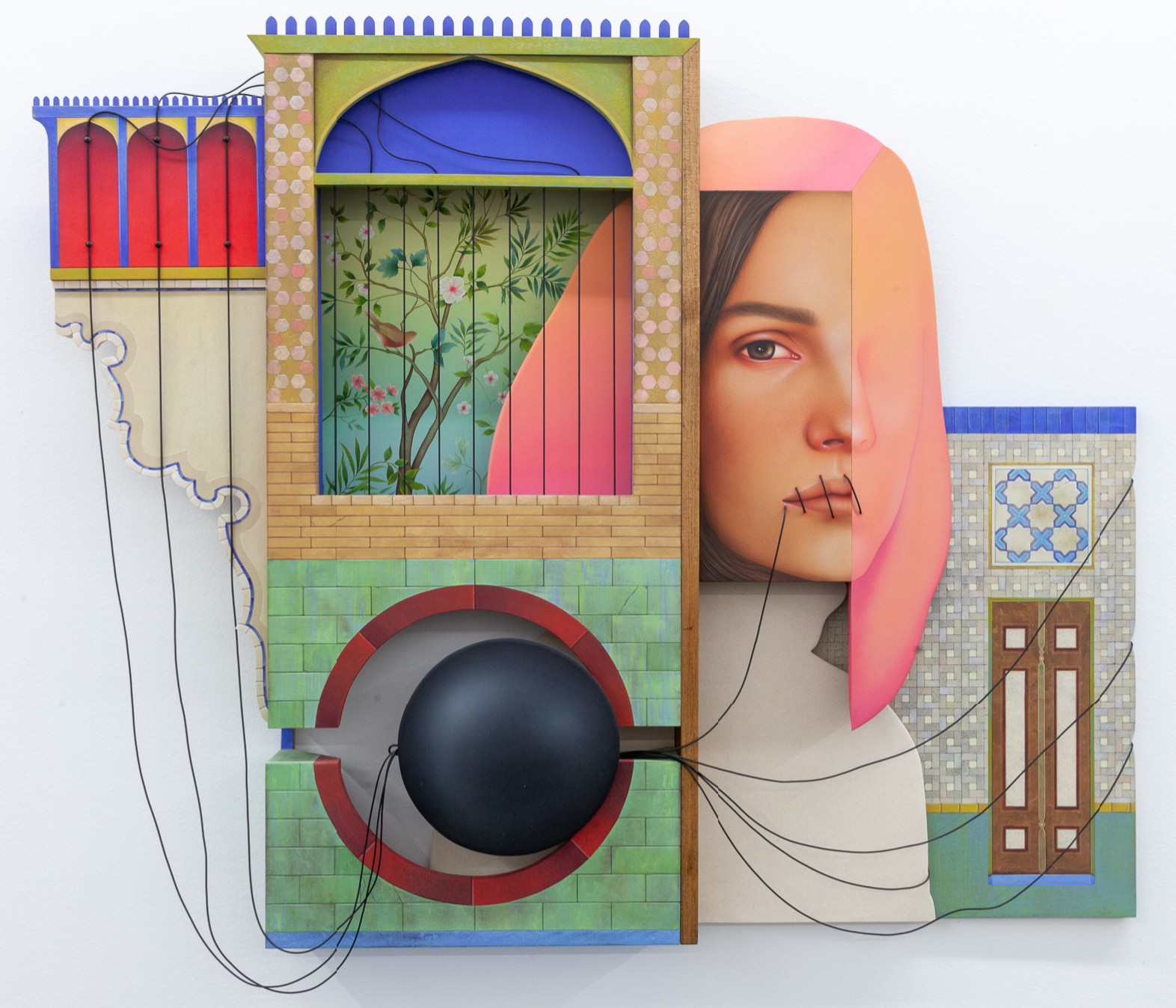 Born in Iran and now based in Stamford, Connecticut, Khosravi blends Persian decorative motifs with Surrealist qualities to create works which explore gender, censorship, and cultural change. Her works emphasize multiple levels of space and reality through the use of different wooden panels connected by cords. As in "The Garden," Khosravi often symbolizes the censorship of women's voices by sewing shut the lips of her figures.