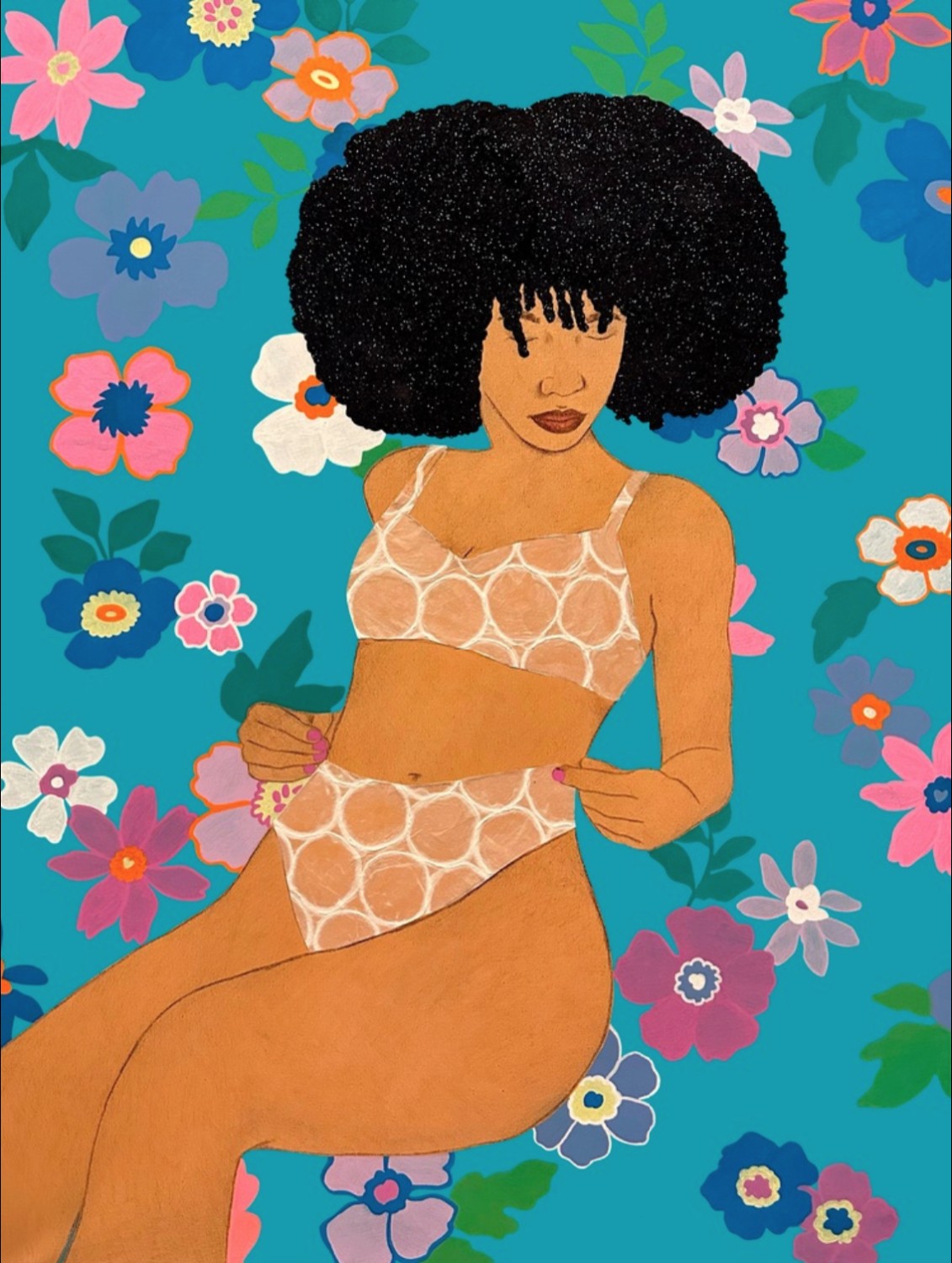 Alfonseca, based in the Bronx, New York, emphasizes the experiences of Black and Afro-Latinx women, surrounding her figures with bright colors and patterns and adorning them with glitter and mixed media. Her goal is to demonstrate the grace and beauty of her subjects who appear in a safe space which contrasts with the dangerous world they inhabit in their daily lives.