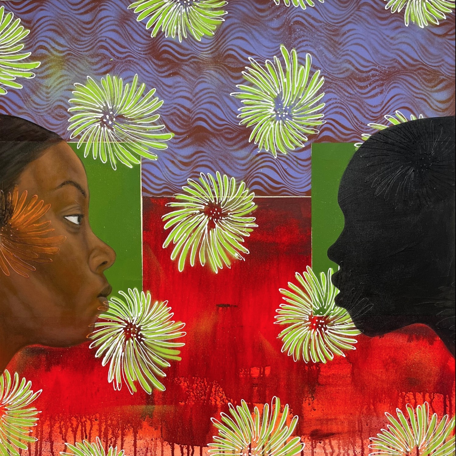 London-based Bono describes her art as expressing afrofemcentrist consciousness, projecting Black women's lived experiences. Her works incorporate patterns from African textiles which are visible around but also through the semi-transparent human forms. The artist's interest in interior and exterior realities is symbolized by the combination of detailed anatomy with silhouetted forms.