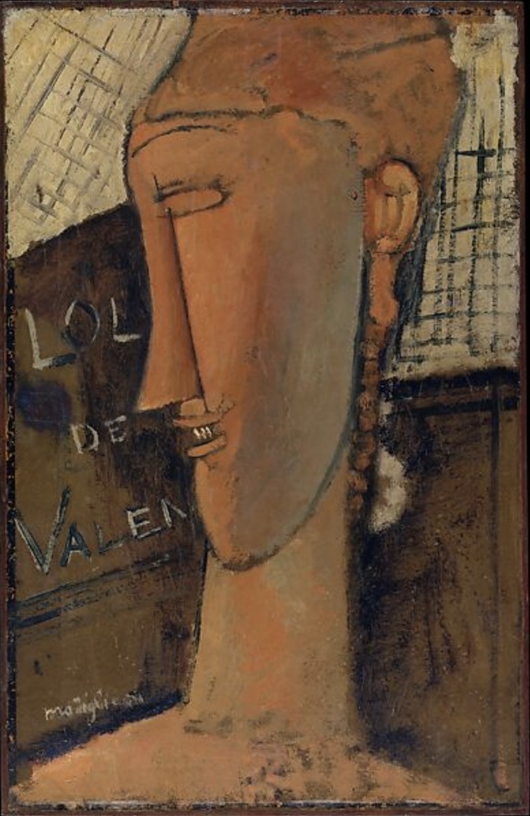 In 1909, after meeting the Romanian-French sculptor Constantin Brâncuşi, Modigliani shifted his focus from painting to sculpture. For about 5 years, Modigliani worked with stone, carving a series of abstract heads and figures which were influenced by Brâncuşi, but which demonstrated Modigliani’s determination to walk his own stylistic path. Four of the artist’s Heads were exhibited in the Cubist section of the Salon d’Automne, an important exhibition in 1912. When the outbreak of World War 1 led to shortages of suitable materials and Modigliani’s deteriorating health made it difficult, he gave up sculpting in 1914. An example of the artist's sculpture appears in the slide show along with a painted variation on those sculpted heads, Lola de Valence, which depicts a 19th century Spanish dancer who was the subject of a poem by the Symbolist poet Baudelaire.
