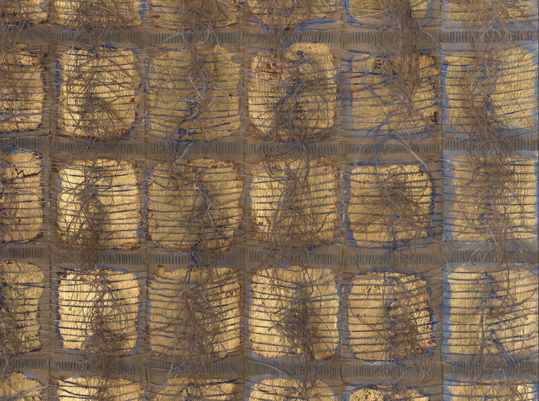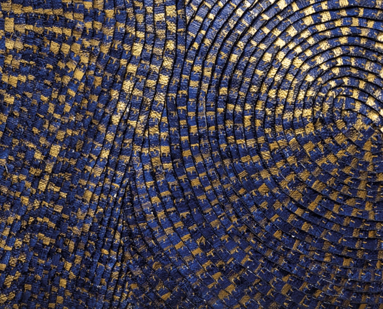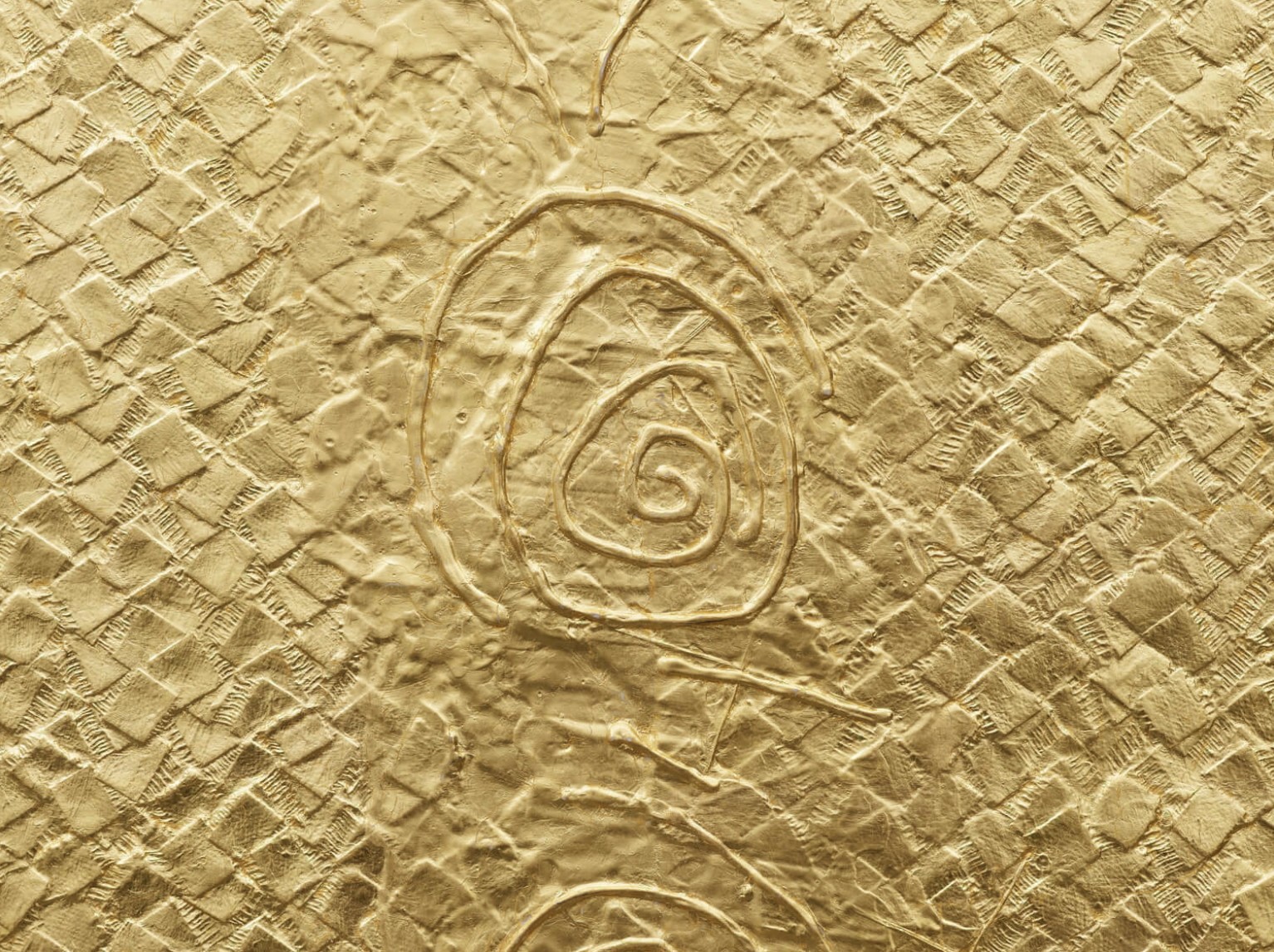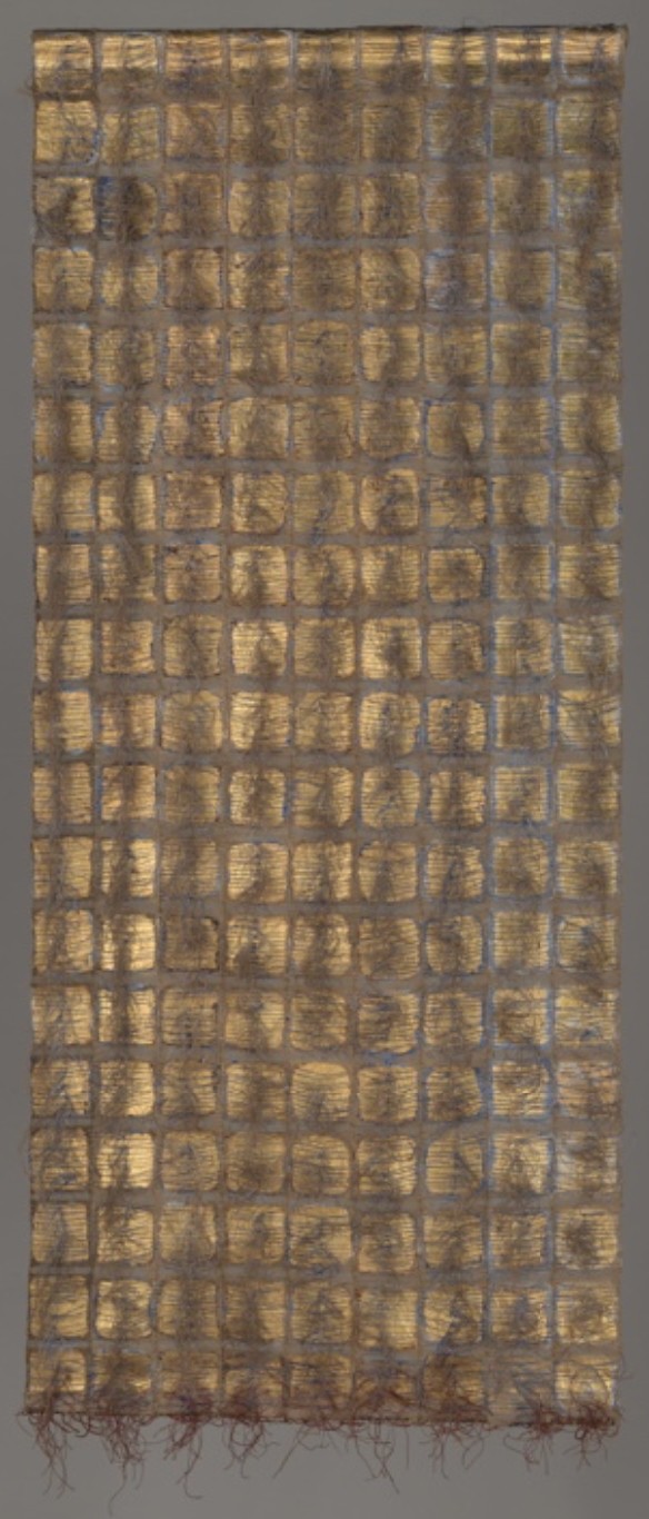 Though she began by creating traditional two-dimensional wall hangings, in the late 60s de Amaral began to explore three-dimensional forms and even free-standing objects. The artist uses diverse materials, both natural and man-made; in addition to fibers and dyes, she employs gesso and acrylic paints from the realm of painting and even clay drawn from ceramics and sculpture. However, de Amaral is best known for her frequent use of metallic leaf, platinum, silver, and especially gold. The artist was drawn to gold for its visual effects but also for its connections to the history of Colombia, before and after the arrival of Europeans.