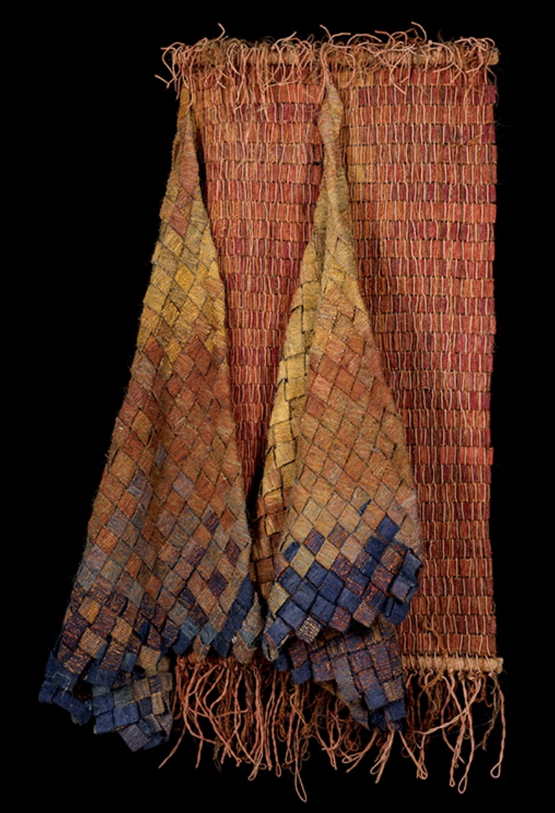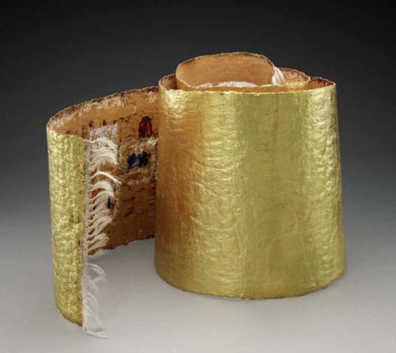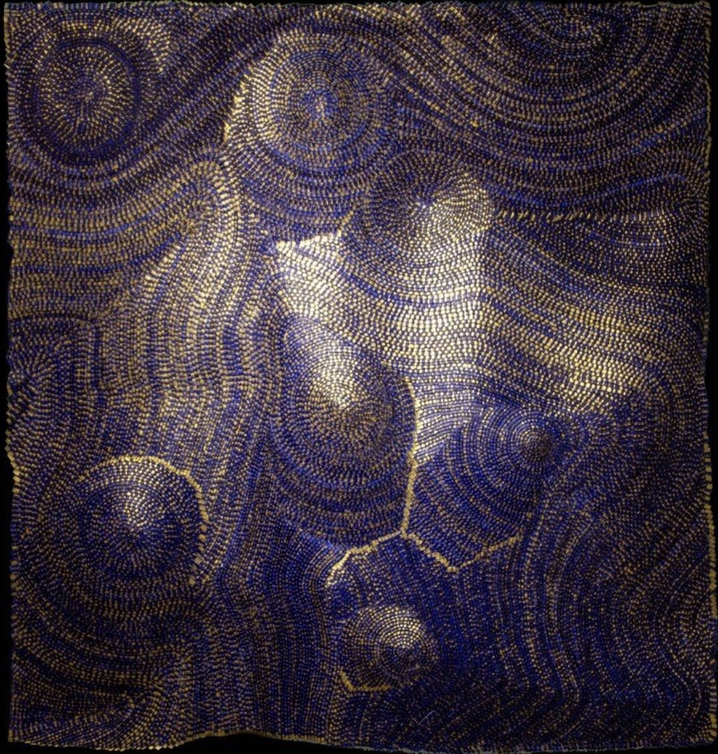 Though she began by creating traditional two-dimensional wall hangings, in the late 60s de Amaral began to explore three-dimensional forms and even free-standing objects. The artist uses diverse materials, both natural and man-made; in addition to fibers and dyes, she employs gesso and acrylic paints from the realm of painting and even clay drawn from ceramics and sculpture. However, de Amaral is best known for her frequent use of metallic leaf, platinum, silver, and especially gold. The artist was drawn to gold for its visual effects but also for its connections to the history of Colombia, before and after the arrival of Europeans.