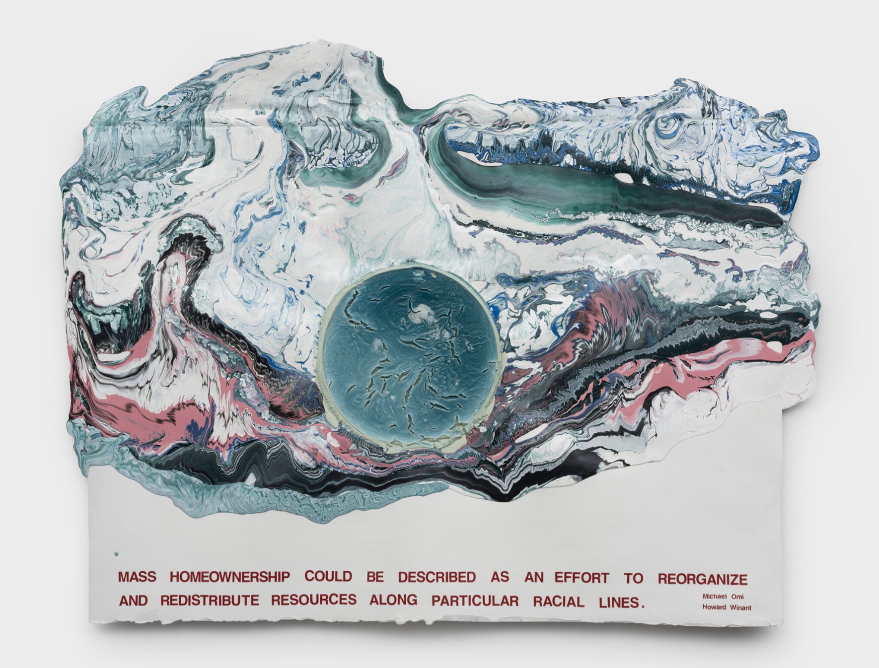 McMillian’s works challenge expectations on many levels. He uses a poured paint technique formerly associated with self-expression to convey his research into the intersections of race, class and power. The abstracted forms which he refers to as landscapes often bear only the slightest resemblance to what viewers expect to see. Finally, the artist’s materials are often drawn from a domestic context yet they carry the weighty presence of history's most painful events.