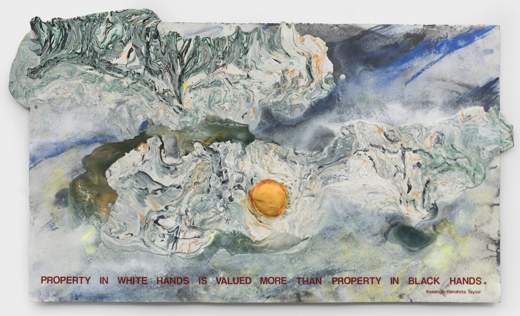 This slide show focuses on works from McMillian’s current exhibition at Vielmetter Los Angeles, entitled Some lives in the sunshine. Comprised of recent paintings, works on paper, and sculptures, this exhibition is centered on the artist’s study of discriminatory real estate practices in the United States. A series of works on paper combines expressively painted landscapes with quotations taken from books and speeches that the artist read as he researched the topic of redlining and predatory lending. In these paintings, McMillian’s political message is more explicit than in some other works but before you ever notice the text, the painter lures you in with vivid colors and flowing swaths of paint.