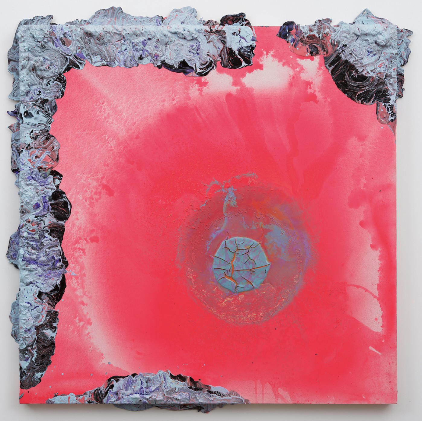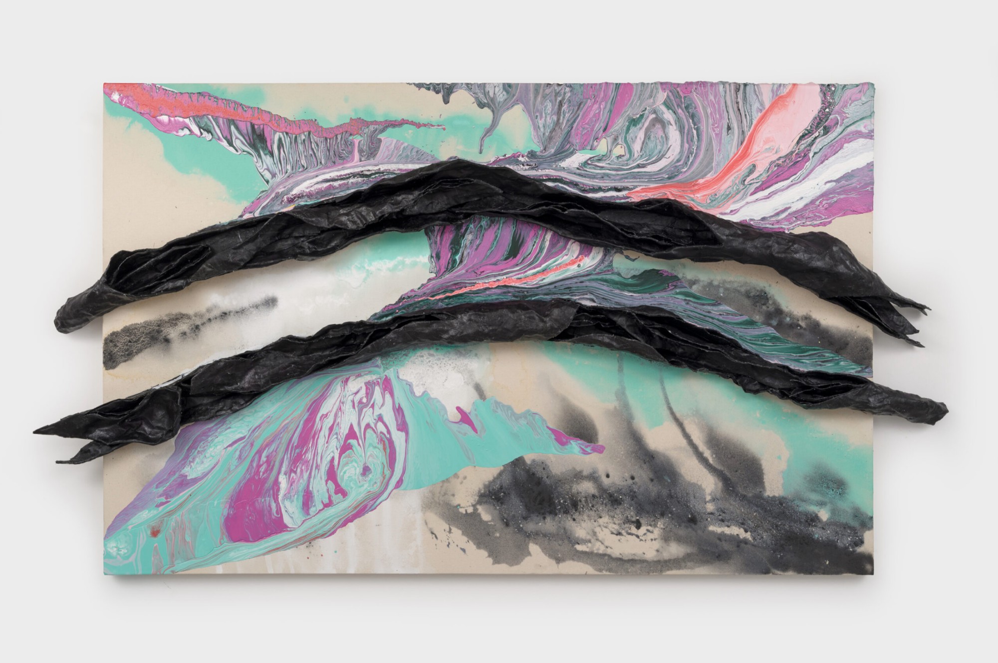 In McMillian’s paintings, whether on paper, canvas, or thrift shop sheets and blankets, the artist pours latex and acrylic paints over the support. The effects vary from fairly controlled to almost chaotic. One recognizes a connection between his technique and that of Abstract Expressionists like Jackson Pollock and Helen Frankenthaler, but McMillian’s goals are far from the intensely personal self-expression that was at the heart of the earlier movement. Instead, he has adapted the poured paint method into a vehicle for his political themes and their emotional toll.