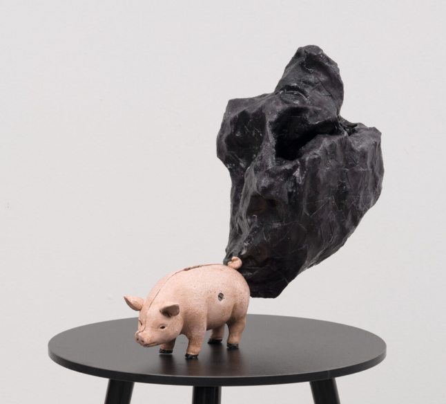 McMillian often uses unexpected materials in his works, including discarded furnishings, blankets and bedding acquired in thrift shops, found objects, and roughly handmade elements. Two sculptures included in this slide show began with piggy banks to which McMillian added protrusions made from chicken wire and fabric painted black. In the object created from a bank in the shape of a globe, the black form has begun to envelop the planet, reminding me of McMillian’s interest in science fiction. The black forms are a feature of many of the artist’s sculptures, intruding into chairs, cabinets and even some paintings. They often appear to be malignant growths, perhaps a manifestation of the blight which racism casts over the lives of its victims.