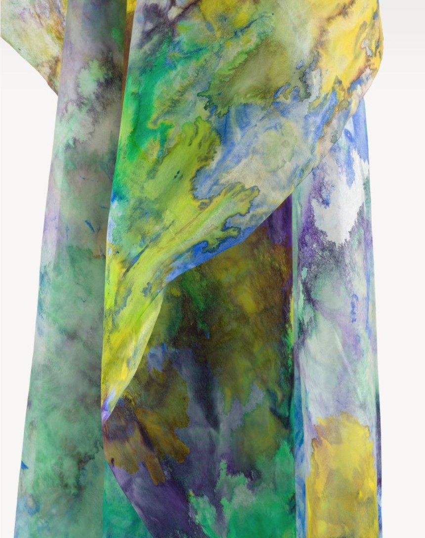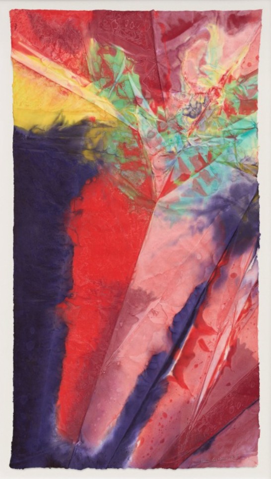 The works on paper in this exhibition also look back, in this case to the watercolors that Gilliam first worked with as an undergraduate student. In the late works, he applied the paint as he had used acrylic on canvas. Using different kinds of paper means that the colors were absorbed in different ways. One key difference between the paper works and Gilliam’s fabric stainings is that the papers accommodated sharp folds not practical in the fabrics. These create clearly defined linear elements which contrast with the flowing colors.