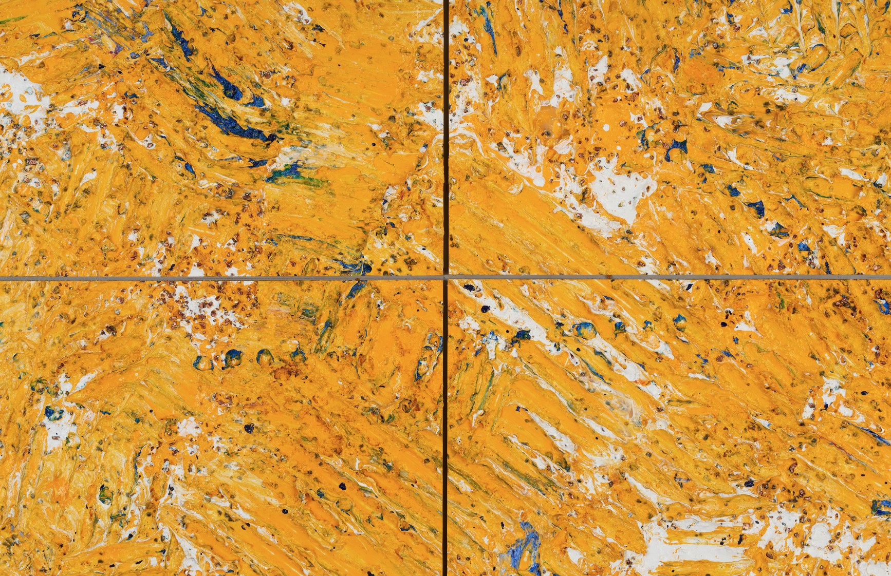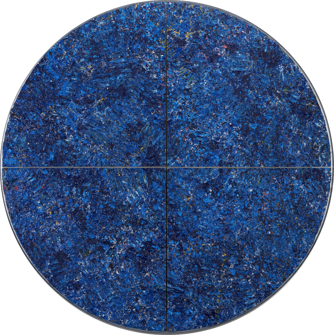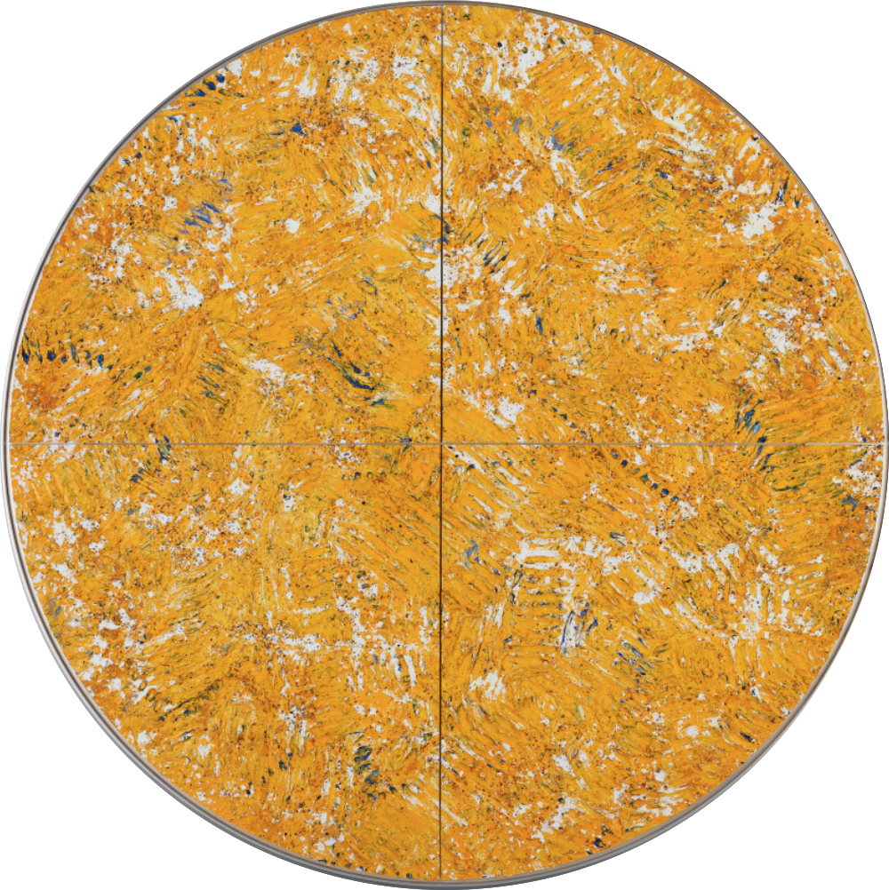 The Tondos are an innovation reached in the last year of the artist’s life and stand apart from his other works in that they don’t include any stained canvas. A tondo is a circular painting, a form dating back at least to the Renaissance. In these works acrylic paint was applied to a wooden support which was then framed in aluminum. The frames divide the circle into four quadrants but the textures and colors are continuous from quadrant to quadrant. The hard-edged shapes look back to Gilliam’s earliest non-representational works while the textured surfaces, many of which contain bits of copper and sawdust sweepings from the studio floor, are reminiscent of the artist's late 1970s White Paintings and Black Paintings.