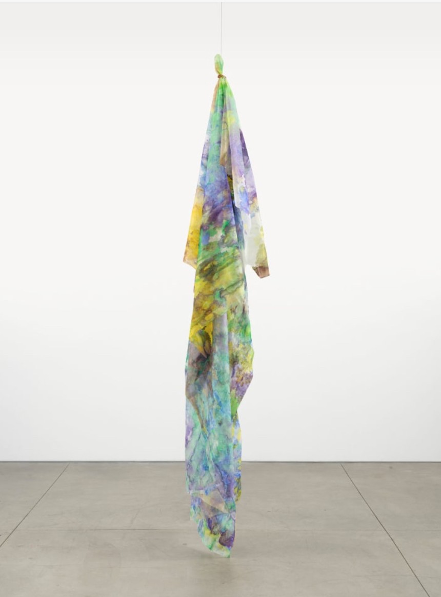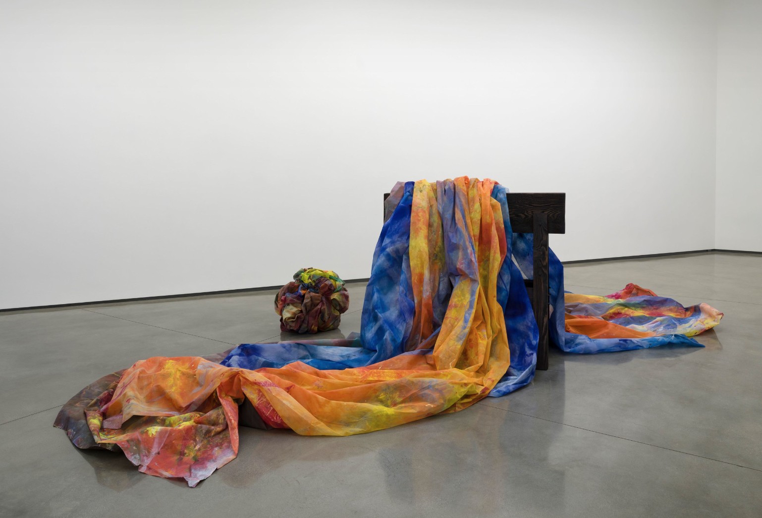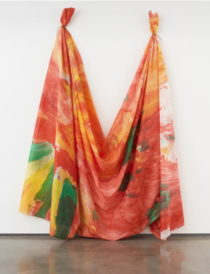 In this Viewing Room, I’ve included a selection of the three bodies of work included in “Sam Gilliam: The Last Five Years,” Drapes, Tondos, and Works on Paper. Works in the Drapes series incorporate space and movement, typically elements of sculpture and architecture, into Gilliam’s paintings. Unlike many of the earlier Drapes, the late examples here are made of Cerex nylon. This lighter weight fabric remains slightly translucent even after staining and seems to float as it hangs from the ceiling or wall. “A” and the Carpenter II is a reimagining of a 1973 work in the collection of the Art Institute of Chicago. These works poke fun at a common criticism of works by Gilliam, Helen Frankenthaler, and Jackson Pollock, that their works look like drop cloths from the studio floor. In both versions, a Drape seems to have collapsed onto a wooden sawhorse. While the earlier version used heavy cotton canvas, the polypropylene fabric in this later version suggests a flowing stream of colors.