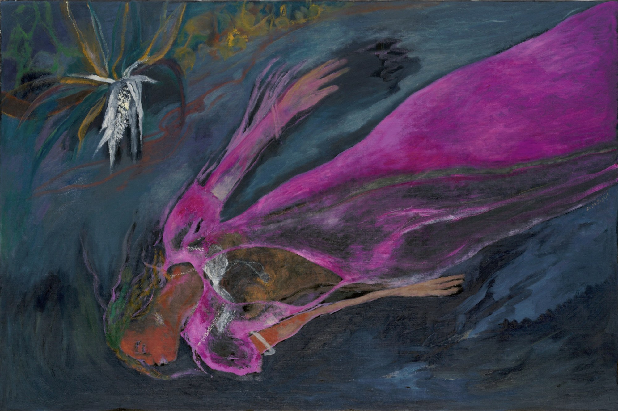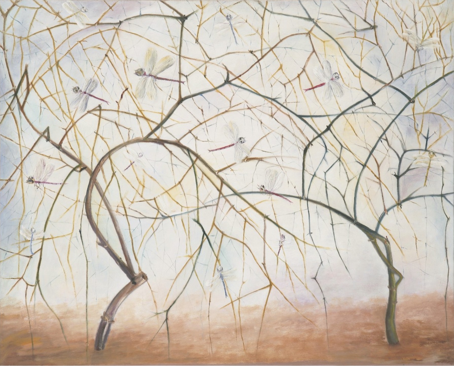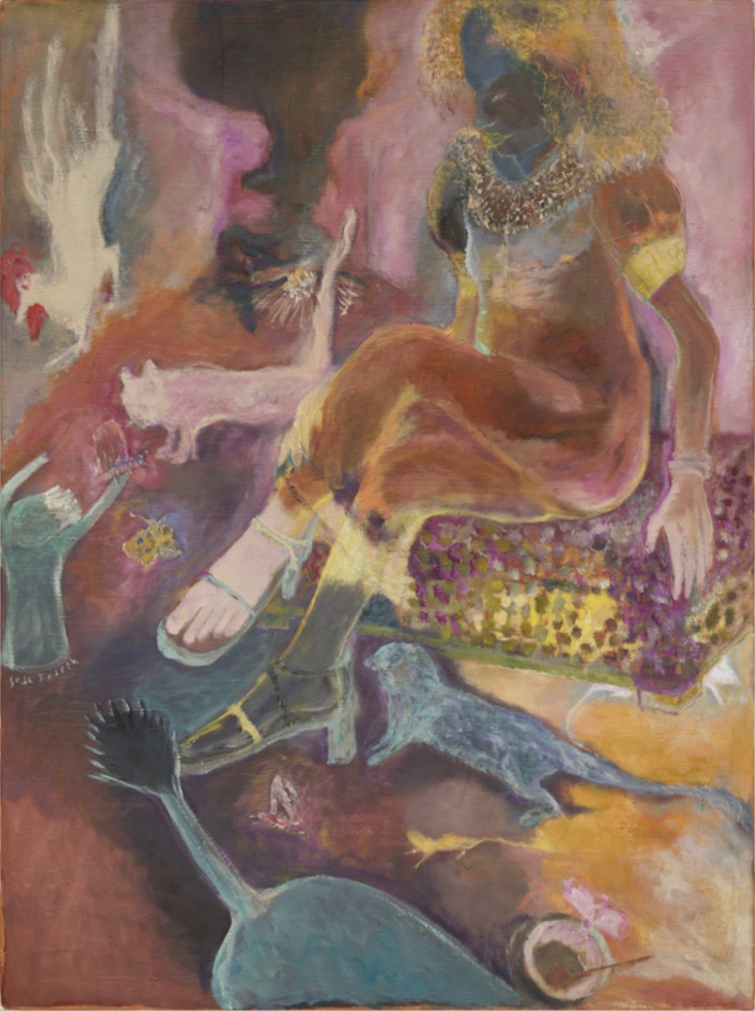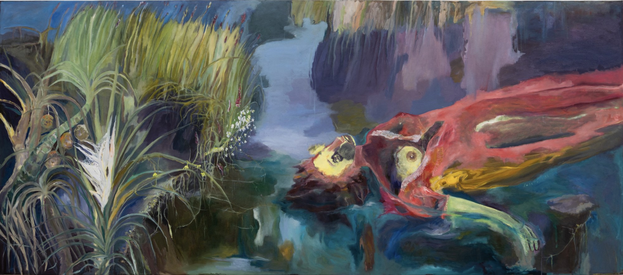 The artist’s technique involves spreading paint on the canvas and pushing it around, scraping it off, adding new layers, resulting in a watercolor effect upon which Joseph builds her compositions. Her process is what leads the paintings to hover between solidity and fluidity, adding the sense that we are viewing memories or dreamscapes. Joseph’s early works were characterized by somber color schemes, but recent works are more vibrantly colored. The artist thinks of herself as “playing by ear” with color; she deliberately resisted learning any kind of color theory, preferring to create new tones, nameless colors she has produced instinctively.