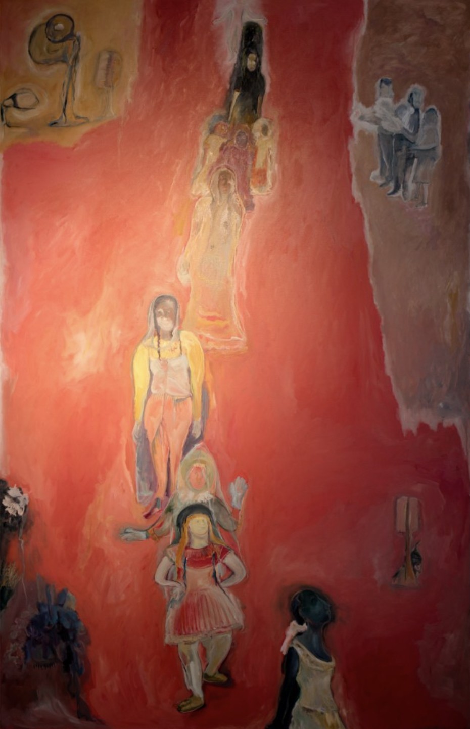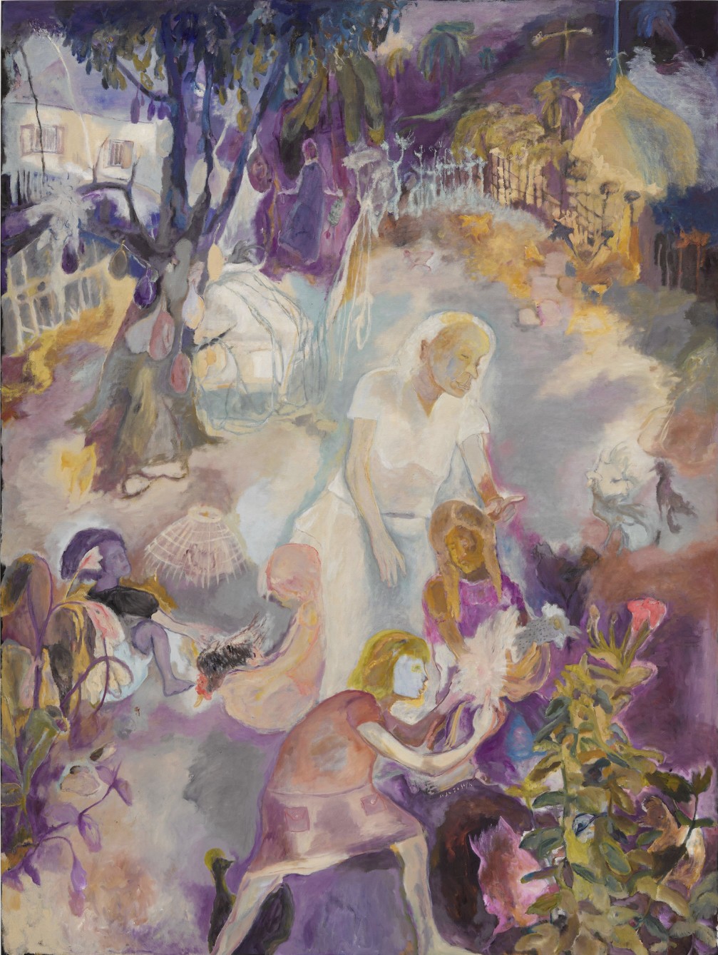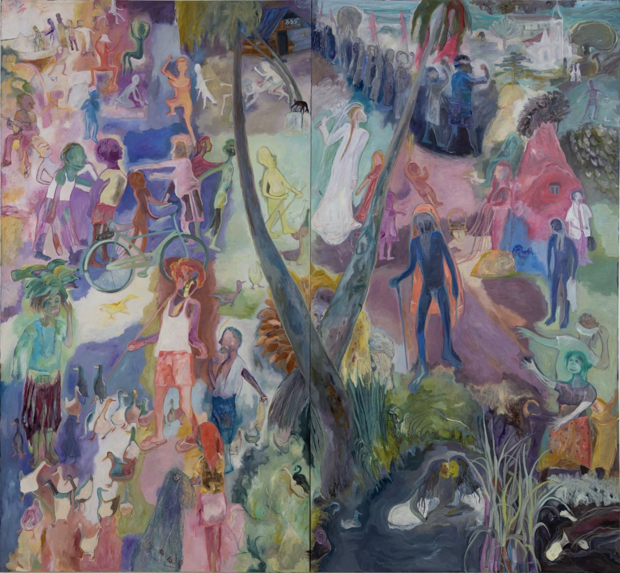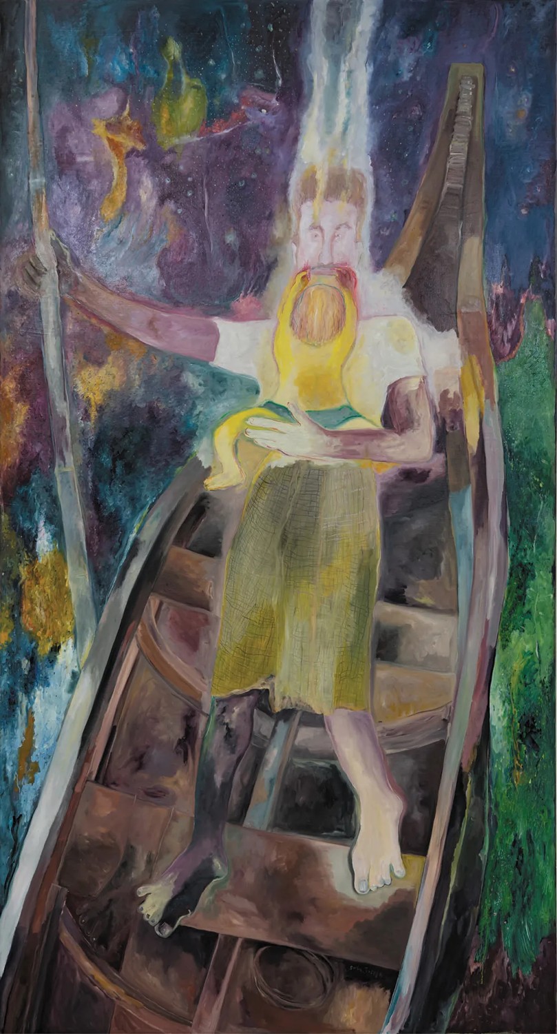 Eastern Orthodox Christianity had come to the Joseph’s island home in the early 20th century, followed not long after by Communism. As a result the community was an unusual blend of deeply felt Christianity and left wing politics. The artist’s father was an active member of the Communist Party who disdained religion while her grandmother was a devout Christian. Daily life was made up of Party marches and church processions against the background of wetlands, animals and birds, rice paddies, sugar cane fields, and swamps. Some of Joseph’s unexpectedly happy memories from her childhood are the seasonal floods. The low-lying river delta saw about six months of rainy season every year, forcing the people from their homes. The children, unaware of the dangers, enjoyed a holiday atmosphere of communal living and constant play. All of these experiences find their way into the artist’s paintings, while the works in the current Zwirner exhibition focus on the flood season.