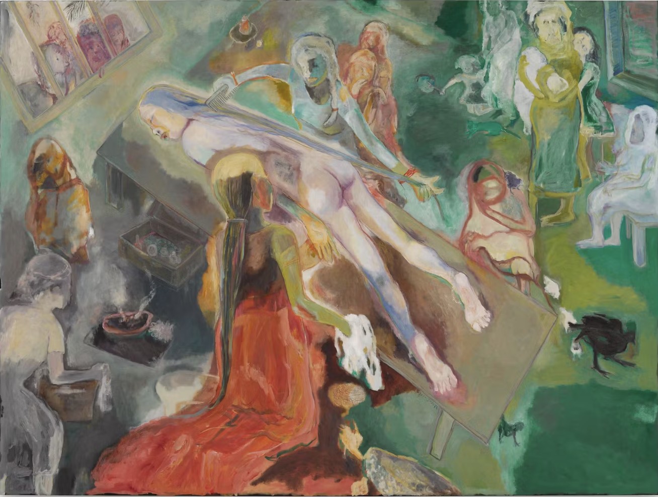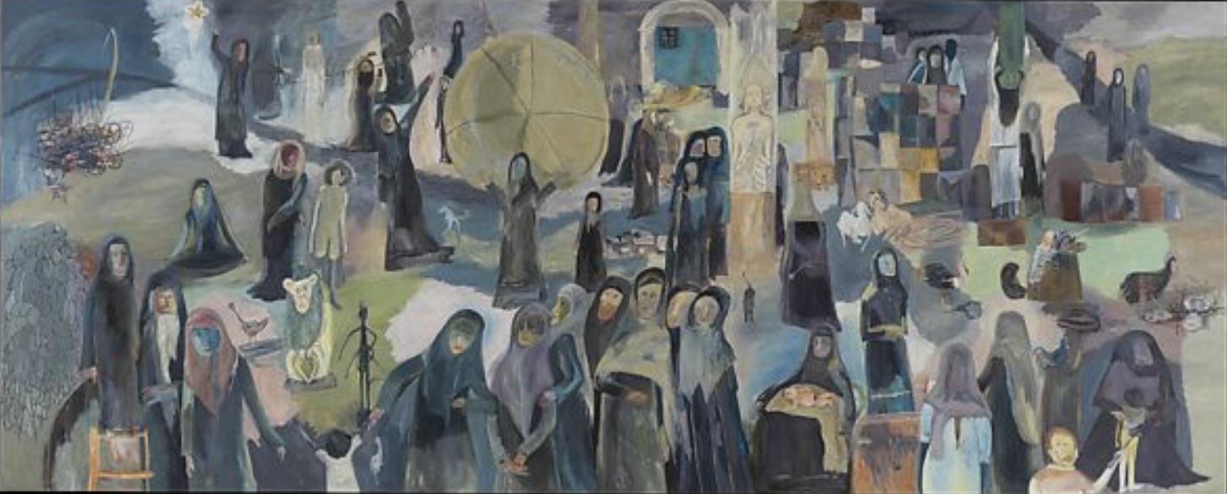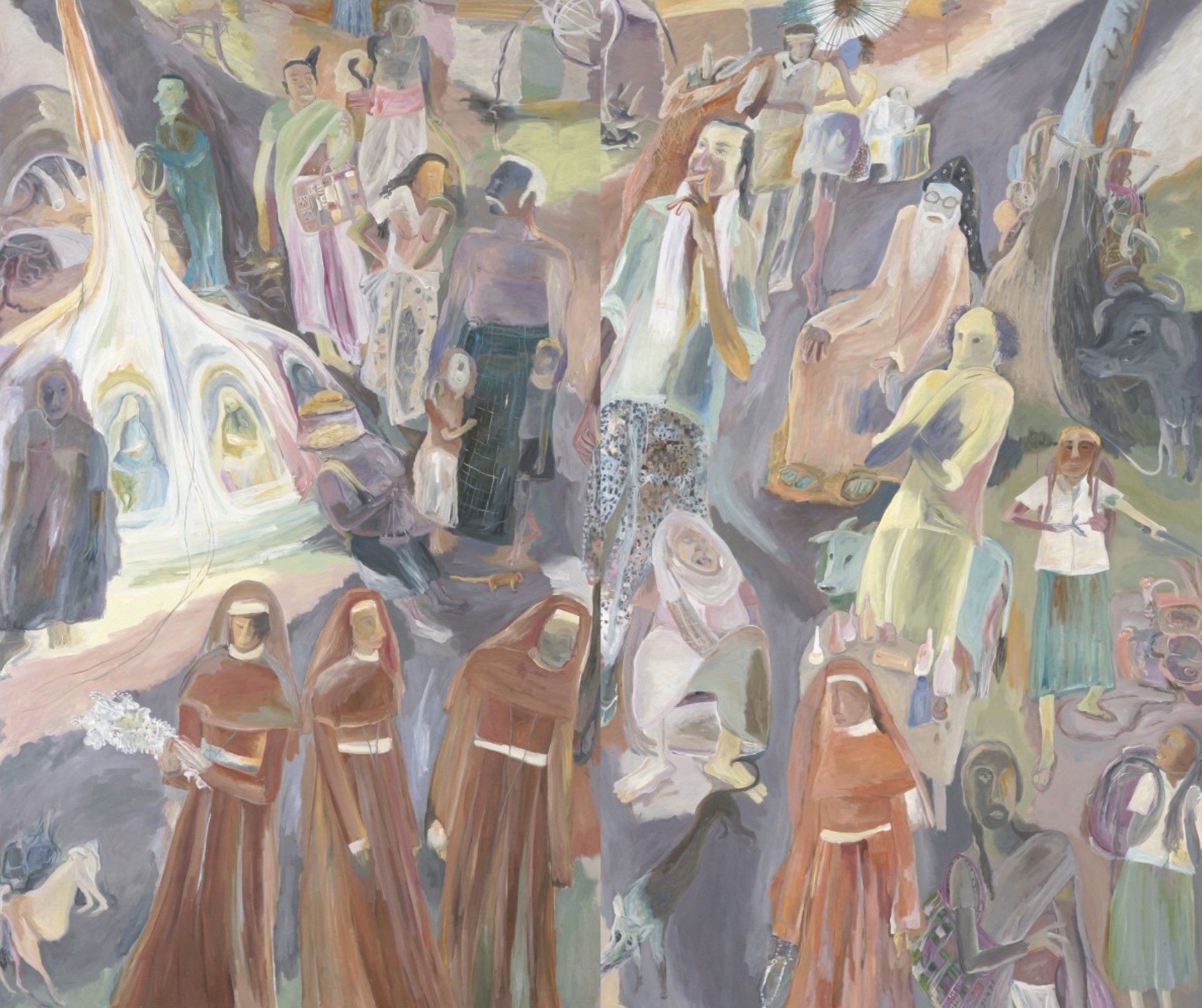 Eastern Orthodox Christianity had come to the Joseph’s island home in the early 20th century, followed not long after by Communism. As a result the community was an unusual blend of deeply felt Christianity and left wing politics. The artist’s father was an active member of the Communist Party who disdained religion while her grandmother was a devout Christian. Daily life was made up of Party marches and church processions against the background of wetlands, animals and birds, rice paddies, sugar cane fields, and swamps. Some of Joseph’s unexpectedly happy memories from her childhood are the seasonal floods. The low-lying river delta saw about six months of rainy season every year, forcing the people from their homes. The children, unaware of the dangers, enjoyed a holiday atmosphere of communal living and constant play. All of these experiences find their way into the artist’s paintings, while the works in the current Zwirner exhibition focus on the flood season.