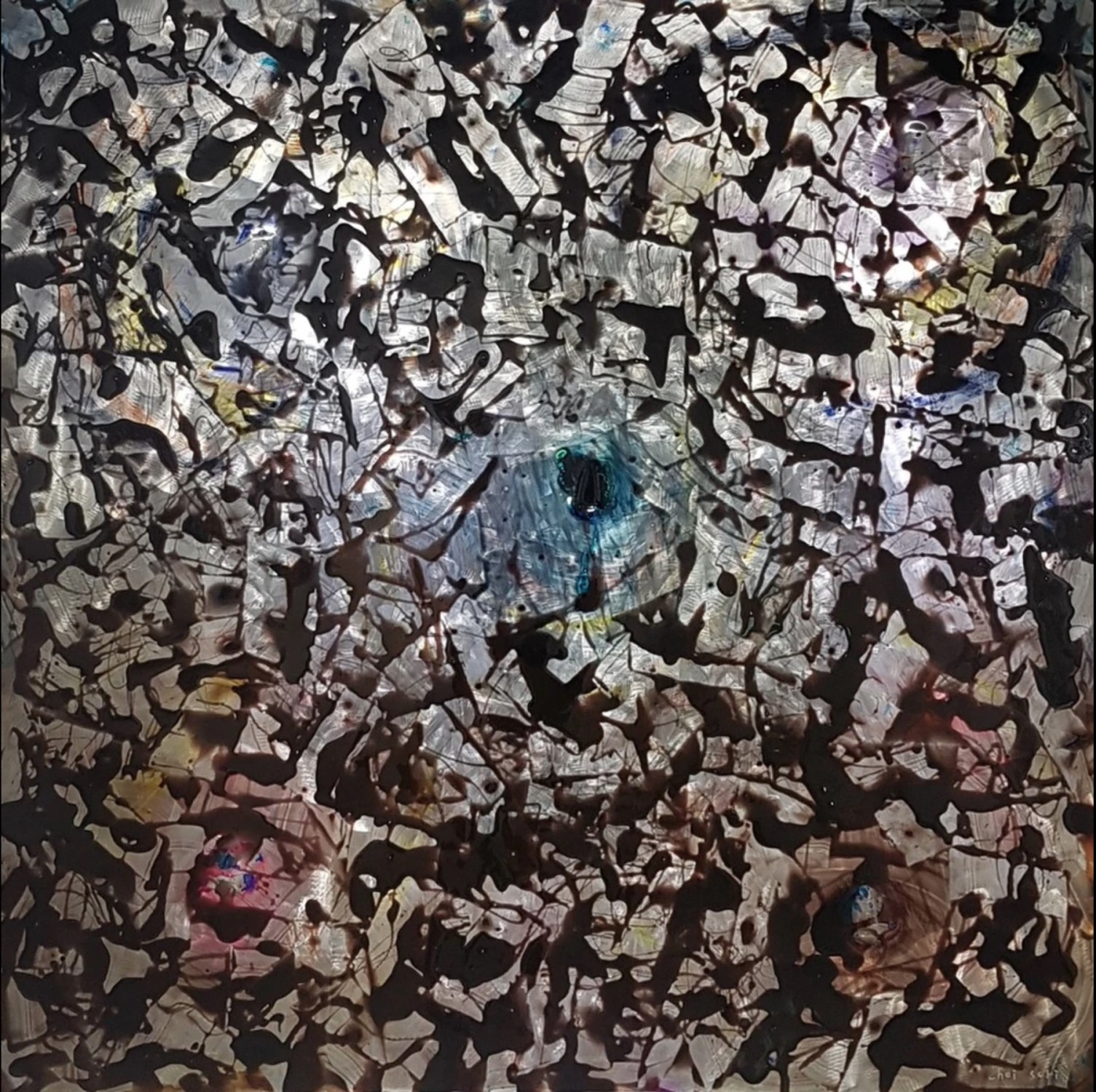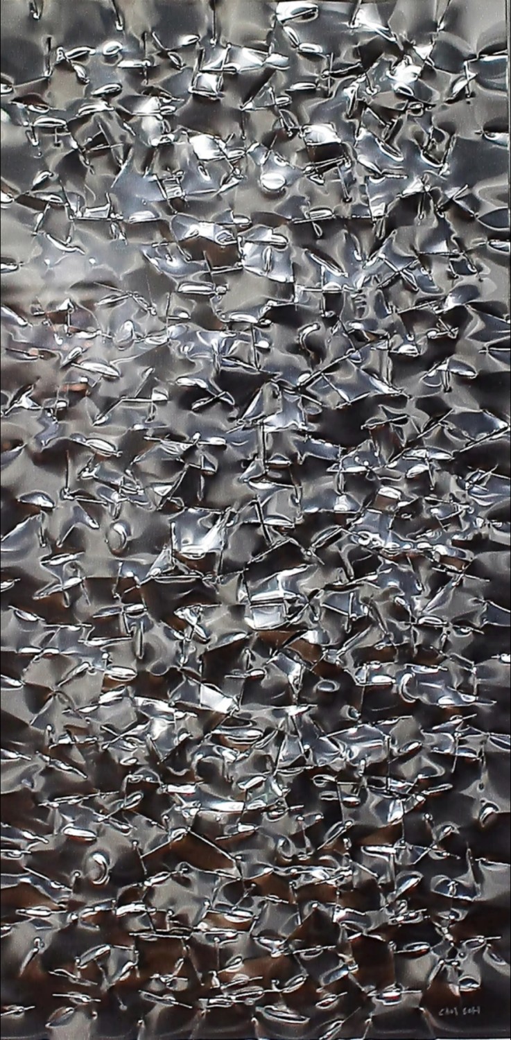 As his performance career progressed, the artist recognized the potential of his percussion tools to create visual art. Choi has used various tools, including drumsticks, mallets, hammers, and even electric grinders to alter the surfaces of his creations. Visible Sound (Kalpa 劫겁) made in 2022 on a sheet of brass and included in the slide show below, is an example of extensive use of the electric grinder. Paint is frequently used to add color to the works, including many in the slide show. A good example of Choi's combining of percussed marks with painted elements is Visible Sound (Flower Road 5), a mixed media on canvas work from 2020. When the artist moved to the mountains near the southern edge of the Korean peninsula, he began to leave pieces of metal and canvas in the landscape, to allow natural forces to affect them. Choi then uses these objects as a base for his own interactions with his supports. He views such works as a means of communication between nature and humanity.