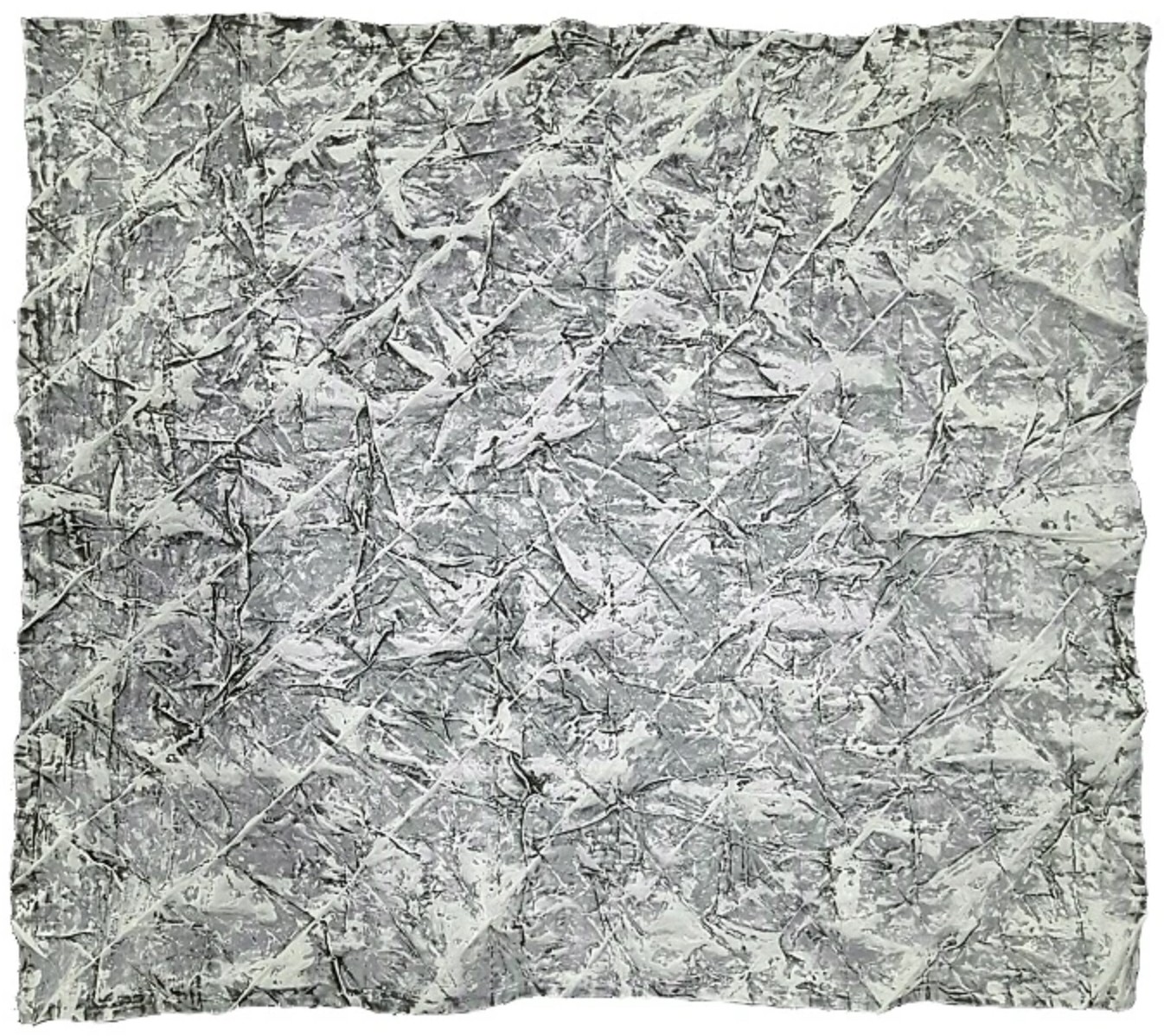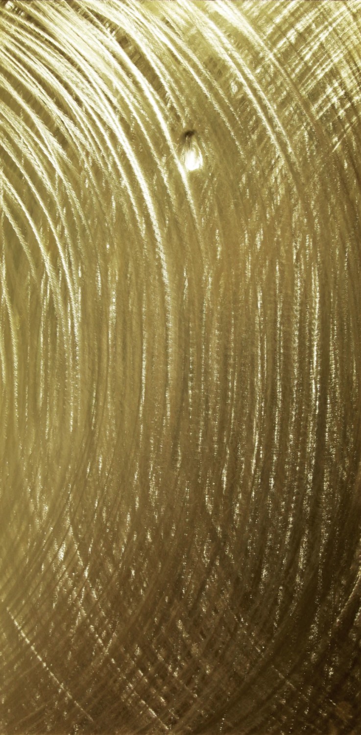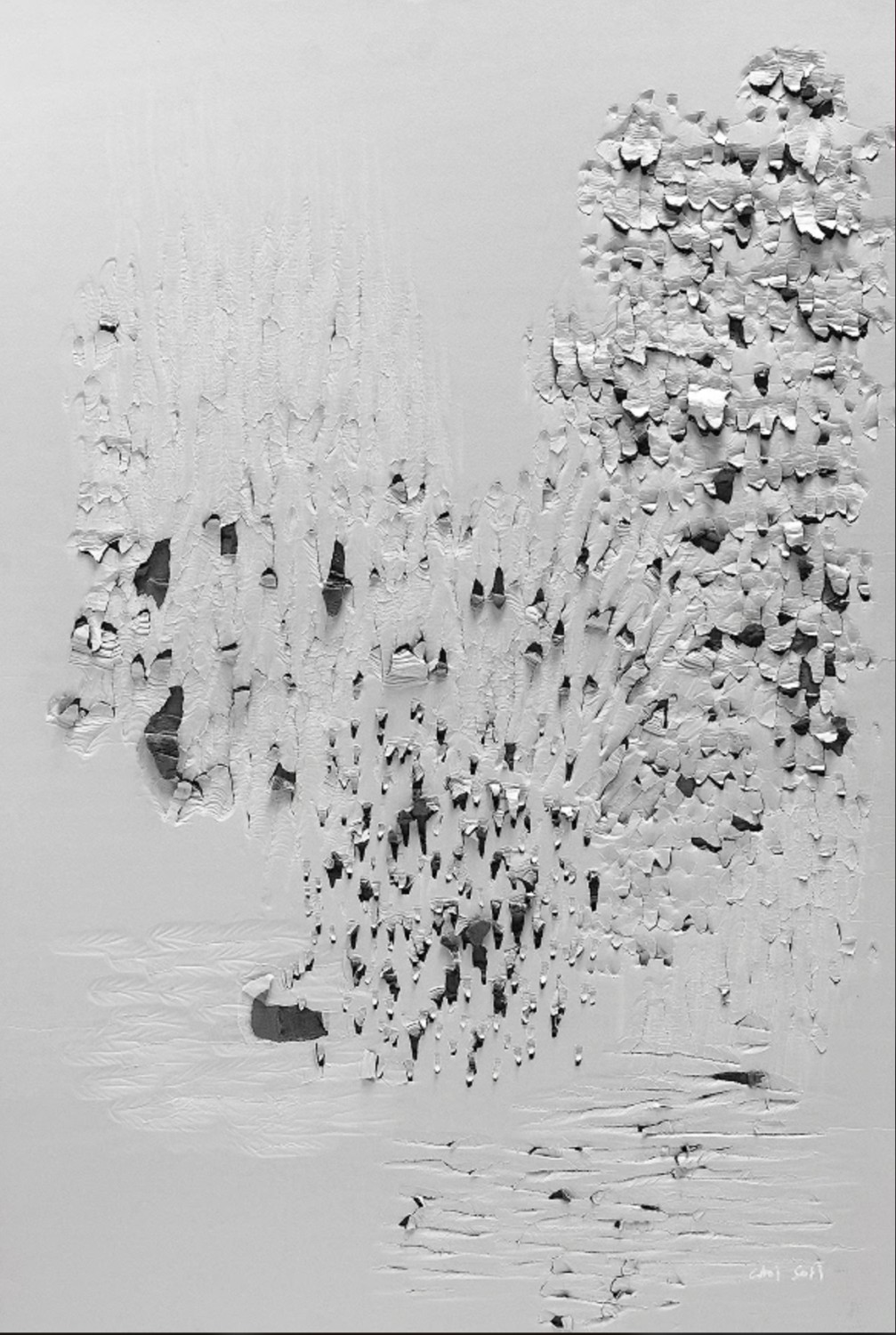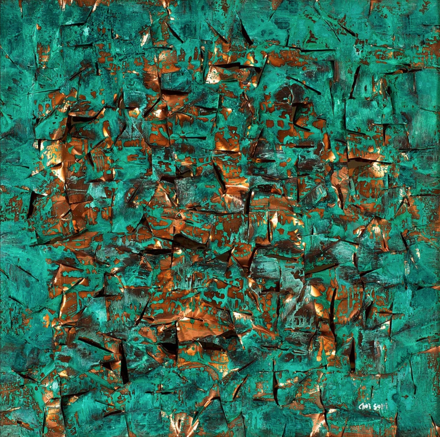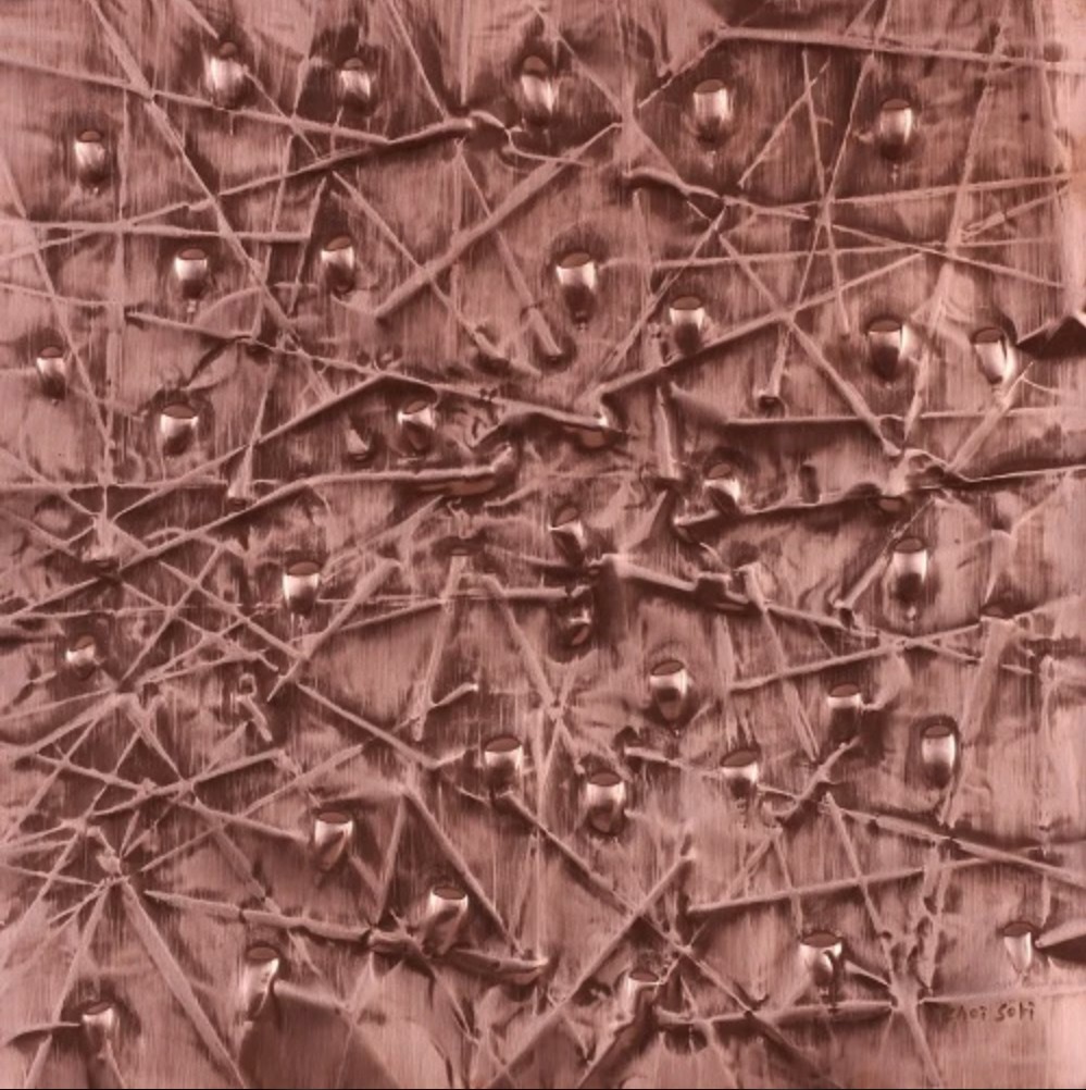 Choi’s percussion performances have been described as “mysterious, unfamiliar, and even . . . deeply moving.” As his visual art is an extension of his immersion in both natural and man-made sound, the artist usually uses “Visible Sound” as a title or part of one. It’s hardly surprising that many of Choi’s works are made from sheets of metal – aluminum, brass, and copper, as these material create sound when struck. The artist has also interacted with other materials, including wire netting, paper, and canvas. Examples of all of these are included in the Viewing Room. No matter the support he chooses, Choi explores the sonic possibilities inherent in his materials. The finished work is a record of the artist’s actions, a concept which is found in the mid-20th century artistic movements Gutai, Abstract Expressionism, and Lyrical Abstraction. This characteristic is especially noticeable in Visible Sound (Gray Land), 2010.