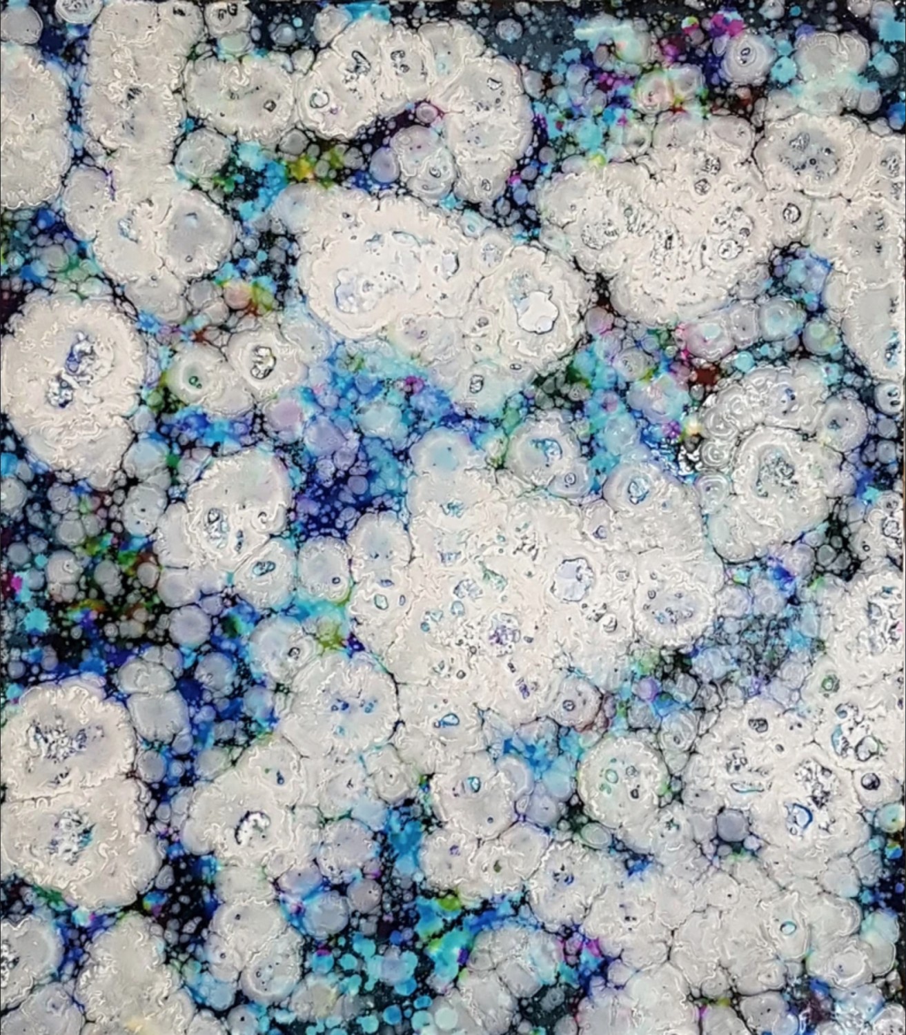 Choi describes himself as entering a state of samādhi (a Buddhist concept of intense meditative awareness) in the presence of nature and sound, and in the act of creating both music and visual art. This spiritual approach, in which the specific acts of making are instinctive or not consciously produced, has similarities to Zen Buddhist painting techniques used in China and Japan beginning in the 12th century and in 20th century Russian artist Wassily Kandinsky’s Improvisations. The Surrealist technique of automatic writing is also related. However, Choi is unique in his regular use of percussion methods in creating his works. This short video shows the artist at work: youtu.be/mSCwHX8mMdE.