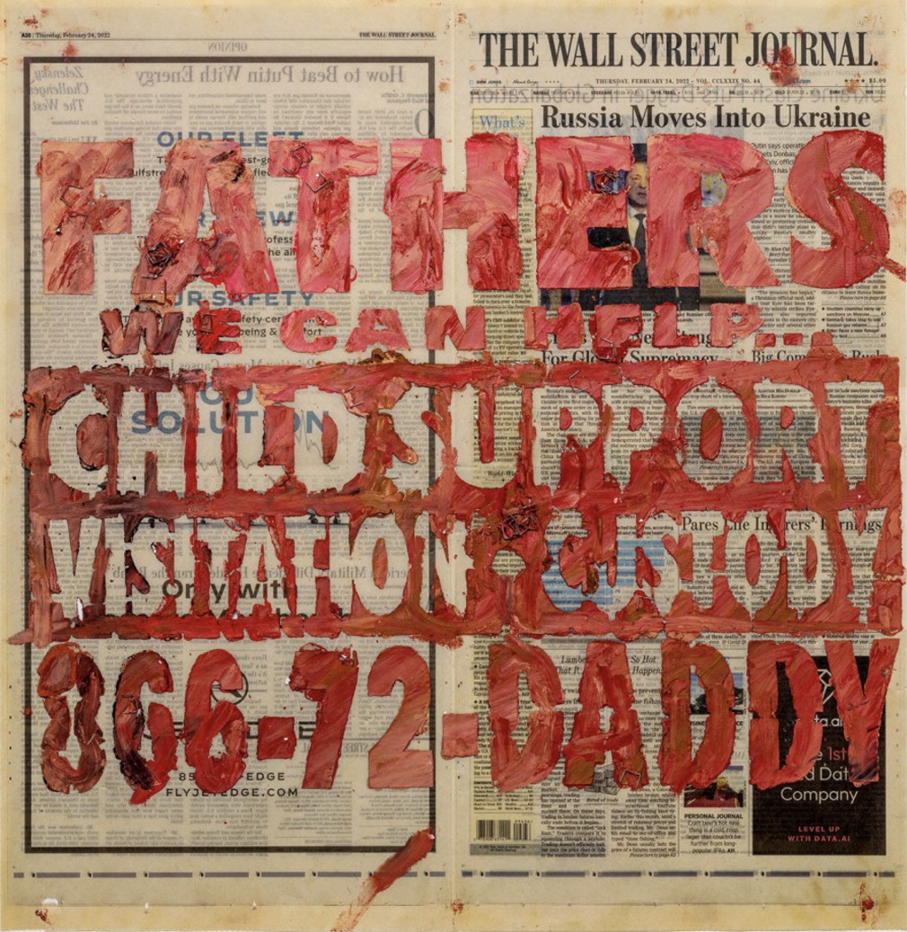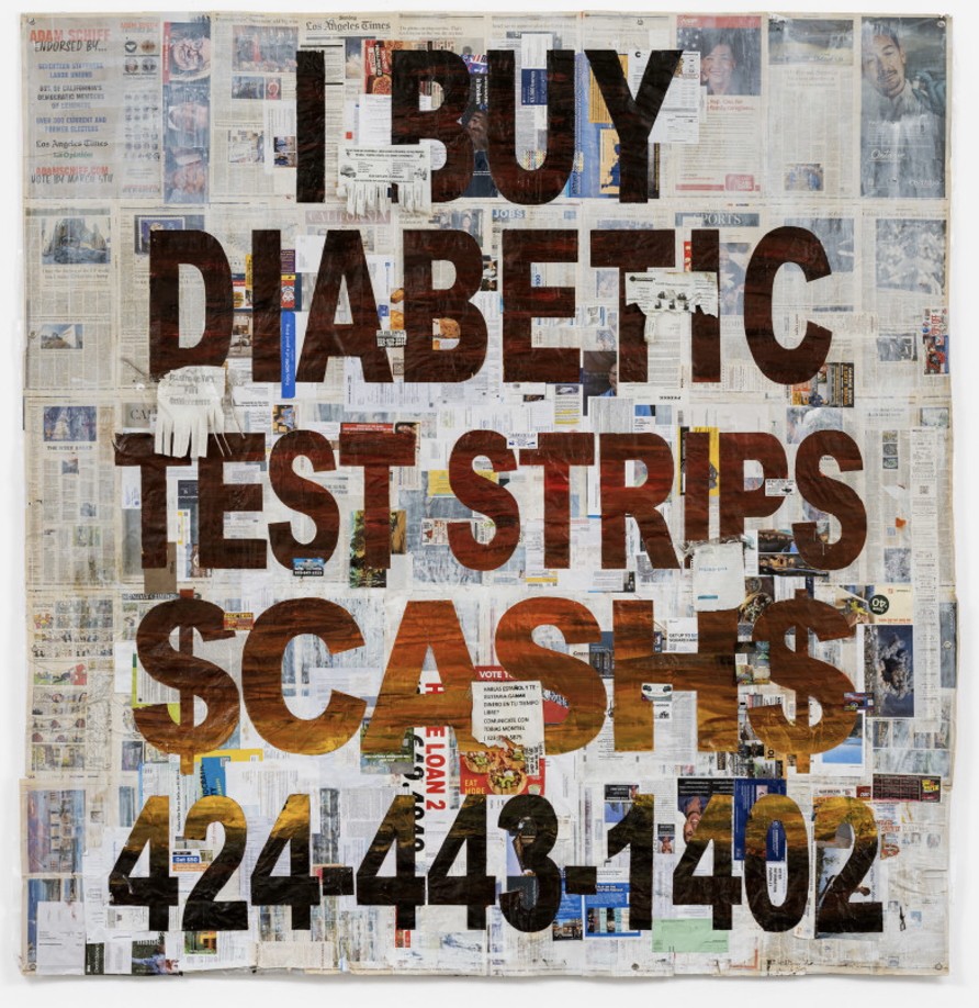 The largest works in the exhibition are part of Beshty’s Bandit Sign Painting series. “Bandit signs” are any which is attached to public or private property without official approval. Many such signs are innocuous but others suggest a questionable or underground economy. The artist first began collecting such signs during the international economic crisis of 2007-2008. In this series, the artist enlarges these signs proportionally until they create looming objects, intended to suggest the economic desperation of those who might seek the services offered. The large versions include layered materials with cut out sections obscuring the message. This layering mimics the way billboards and public message boards build up over time only to decay into strange incomprehensible arrays of patterns and colors. For the smaller versions, Beshty used oil pastels on newsprint; the oil soaks into the paper leaving a thick vivid layer of pigment that obscures the newspaper’s content. Throughout this project the artist explores systems of commerce in which we are all participants, consciously or not.