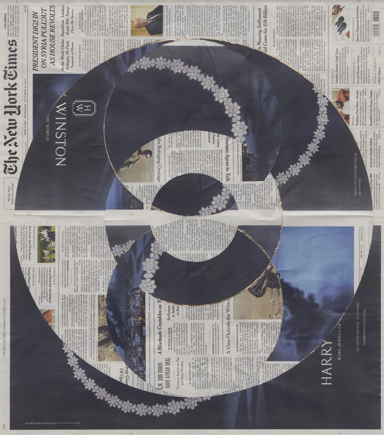 Blind Collages, begun in 2017, are created from the front pages of local newspapers during the process of installation of Beshty’s exhibitions. Using a mat cutter, the artist cuts circles, each half the diameter of the one before, from the newspaper sheet. Then, each circle is rotated 180 degrees. The whole process takes place with the front page turned face-down, leading to the designation “blind” in the title. Pieces are taped into place, but can’t always be perfectly aligned. Gaps are filled with 22K gold, to emphasize the effect of human error.
