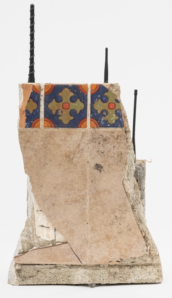 The remaining works in this Viewing Room are included in the Profit and Loss exhibition, though they represent three different projects. One of Beshty’s newest bodies of work is a group of sculptures called Smart Objects. Consisting of pieces of building rubble with the addition of small antennas, these sculptures look like prehistoric versions of technology: radios, pagers, and routers. These works suggest the ways in which our society is quick to dispose of what we no longer need in favor of something newer and up-to-date.