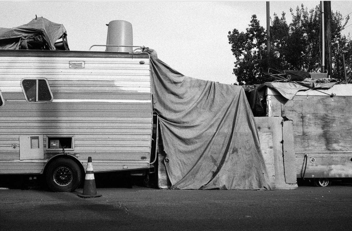 A series of black and white photographs comprise the (Temporary) Homes for Americans series begun in 2021. These depict recreational vehicles and motor homes parked along Union Pacific Avenue in Los Angeles. Photographed in a straight or documentary style, these vehicles intended for recreation are now near-permanent homes to the working poor. The series is a socio-political commentary about abandoned people forced to live in desolate, post-industrial sites by forces far beyond their control.