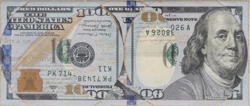 The Banknote series, is a variant of the Blind Collage technique using legal currency from the country in which the work was made. In these works, Beshty is exploring questions of value, the values assigned by society to currency and to art. Issues of faith in institutions and aesthetics are also in play in these works.