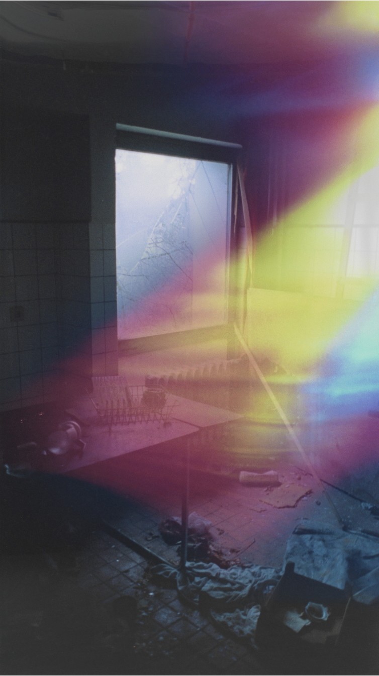 The earliest project included here, from 2006-2008, is Travel Pictures in which Beshty deliberately used film which had been damaged by passing through x-ray scanners as he traveled to Berlin, Germany. In this period of his career, the artist was especially interested in abandoned structures. This set of photographs depicts an abandoned Iraqi diplomatic office in Berlin. After photographing his subject, Beshty once again sent his undeveloped film, unprotected, through the airport’s x-ray scanners. Each of the images in the series ended up with a wash of vivid color across the developed photograph.