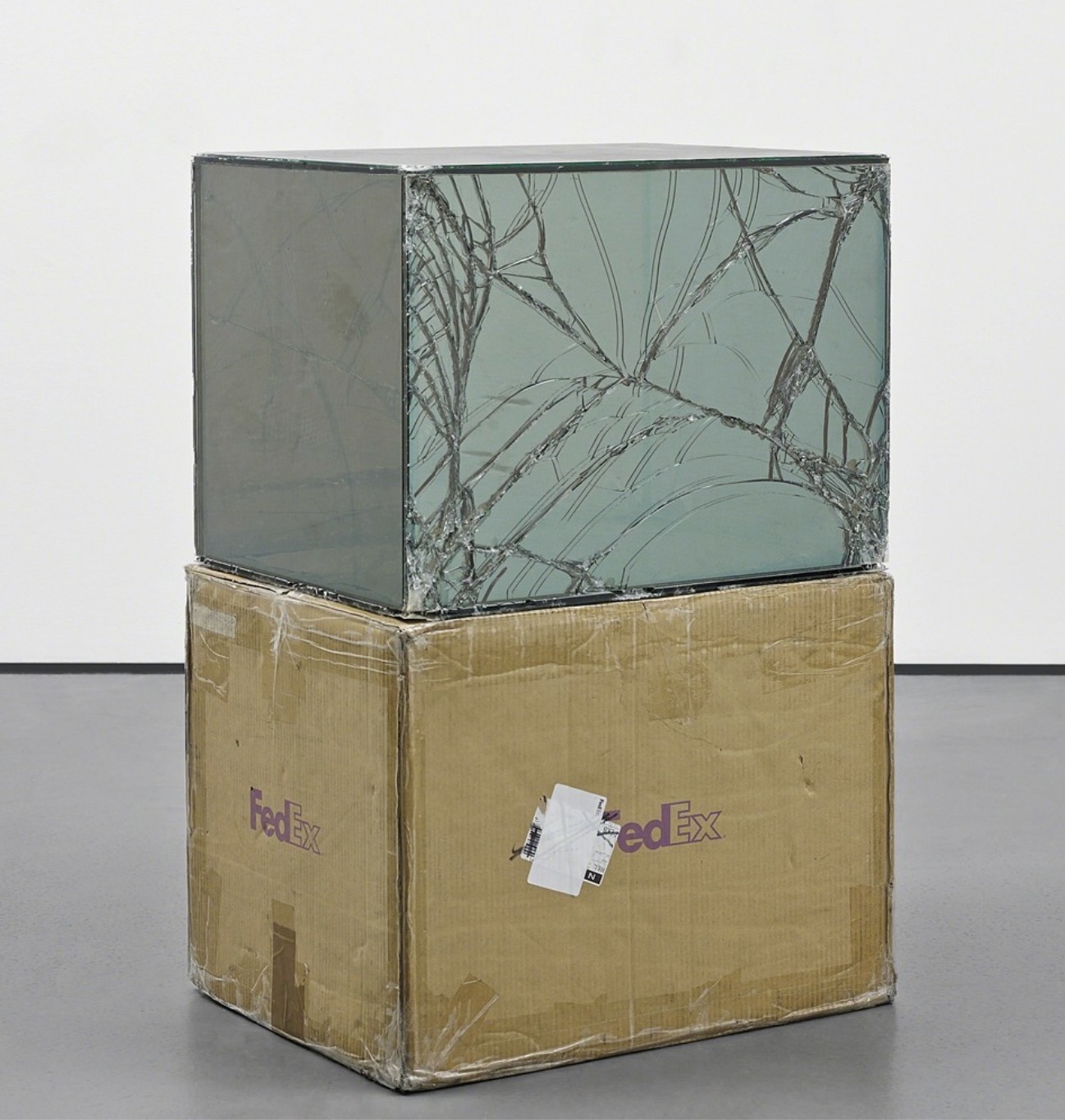 In his FedEx projects, begun in 2007, the artist shipped objects via FedEx, using materials that would capture the effects of the journey. Beshty shaped laminated glass into rectangles which exactly filled the dimensions of FedEx official and proprietary shipping containers. Those containers are combined with the damaged glass objects when the works are displayed, as seen below. The work of art becomes a record of its own journey. In the Fed Ex series, the artist was interested in the way in which corporations control aspects of contemporary life, specifically the idea that a company could “own” the shapes of the shipping containers.